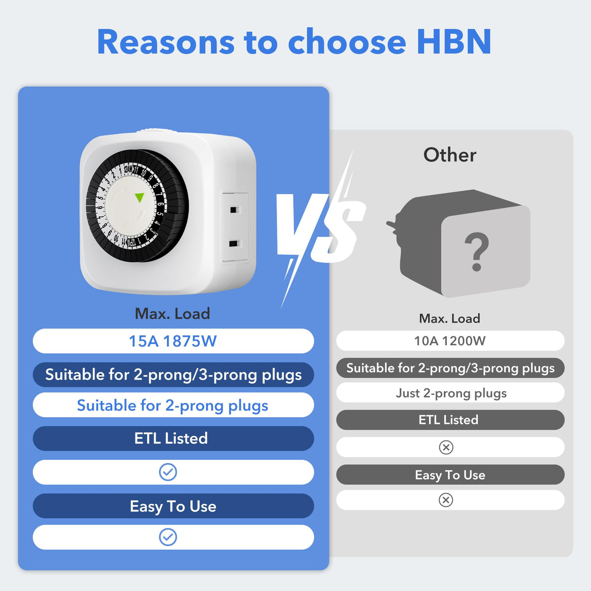 Q: Is this timer compatible with all electrical devices?A: The HBN Indoor Timer is designed for use with 2-prong outlets and can handle devices up to 15 amps or 1875 watts. It's perfect for lamps, small appliances, fish tanks, and even Christmas trees.