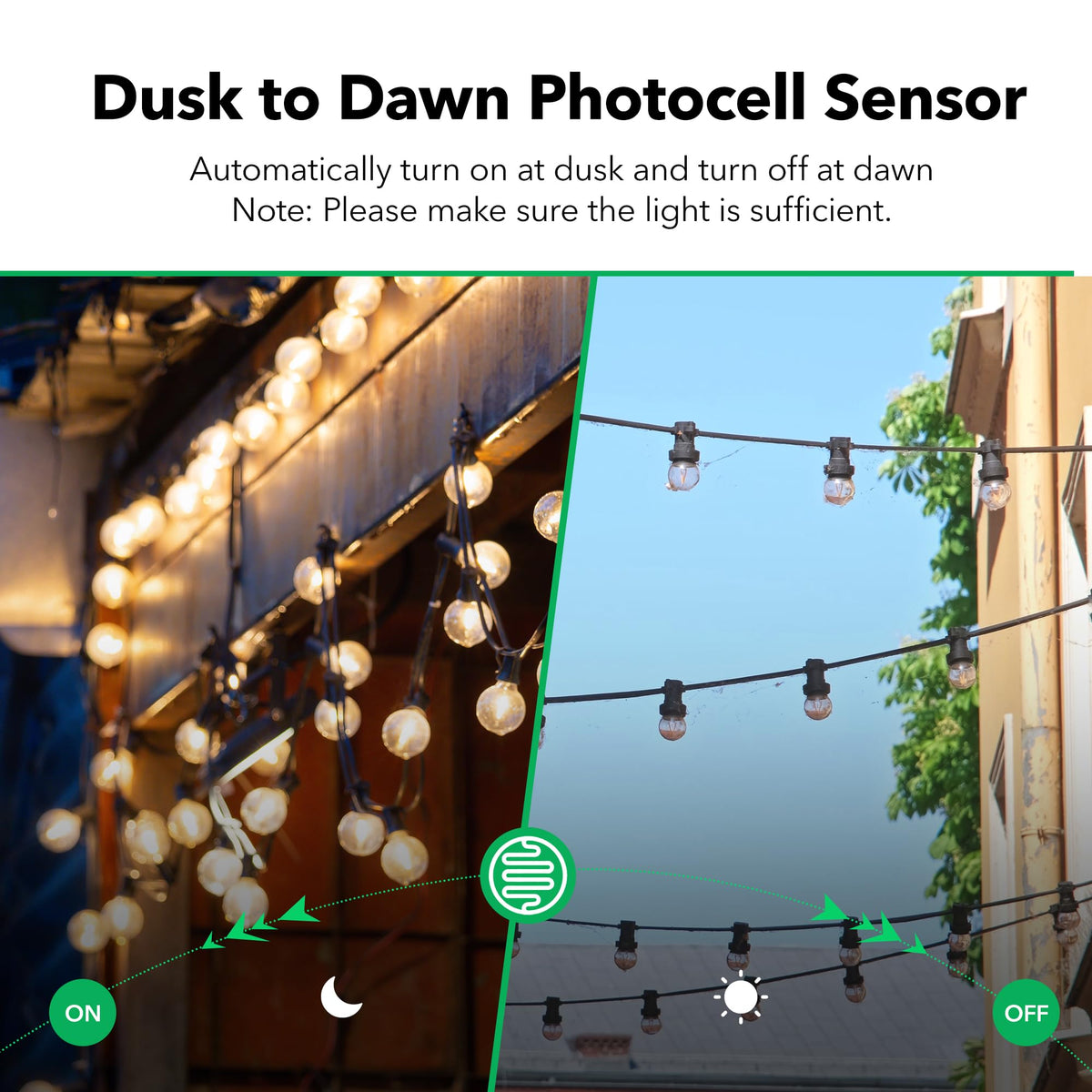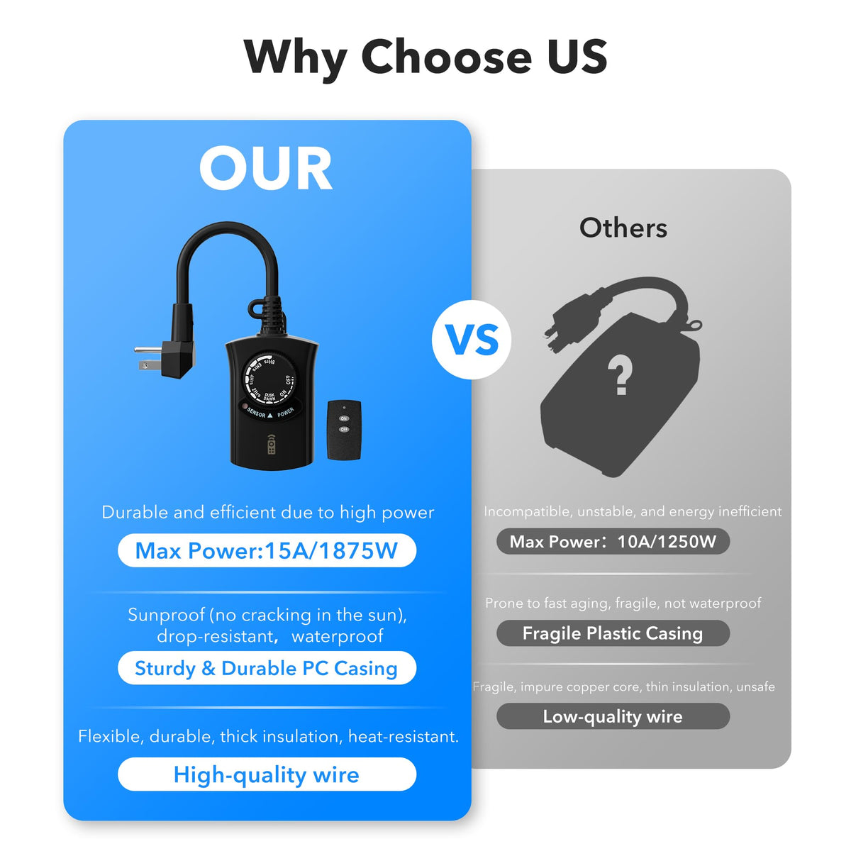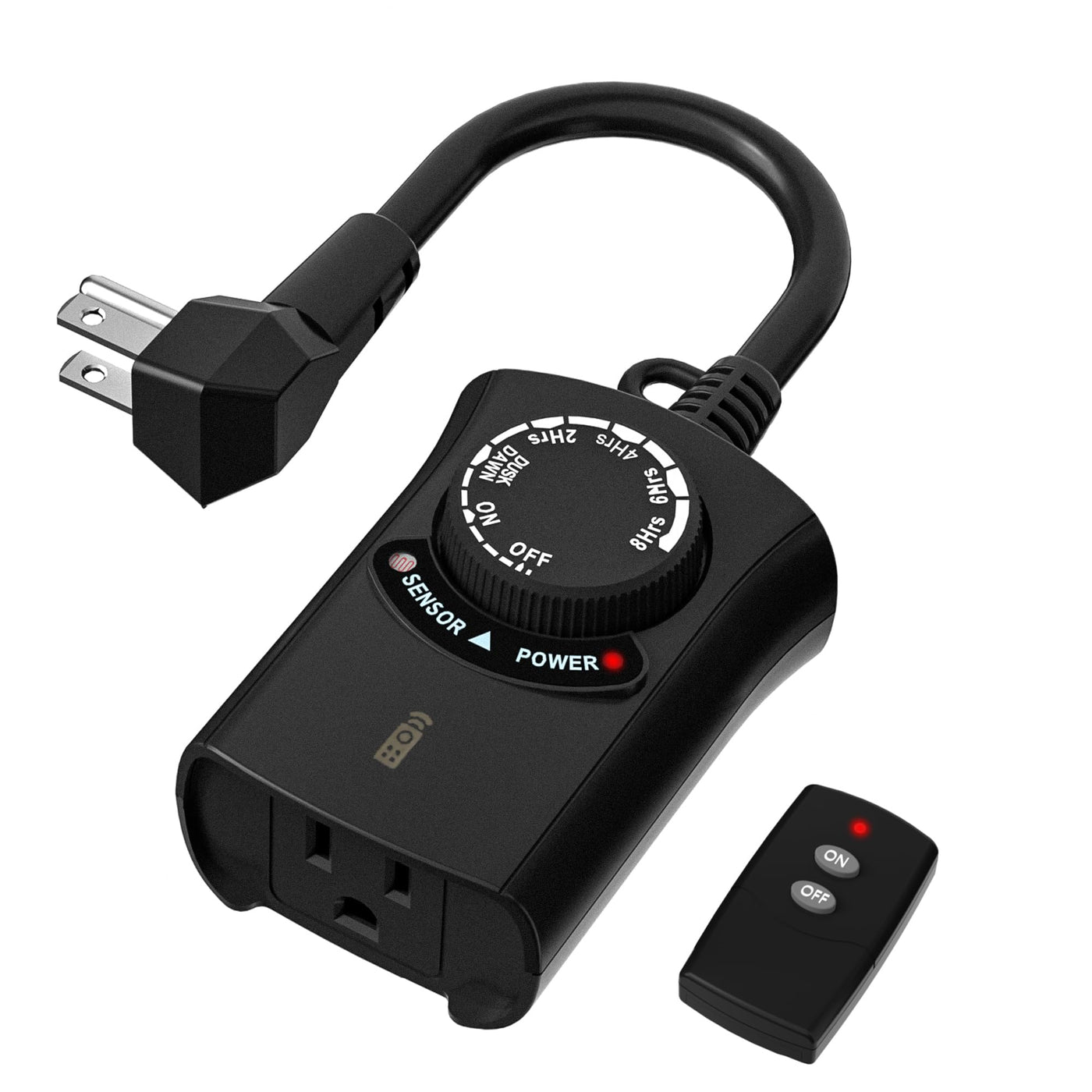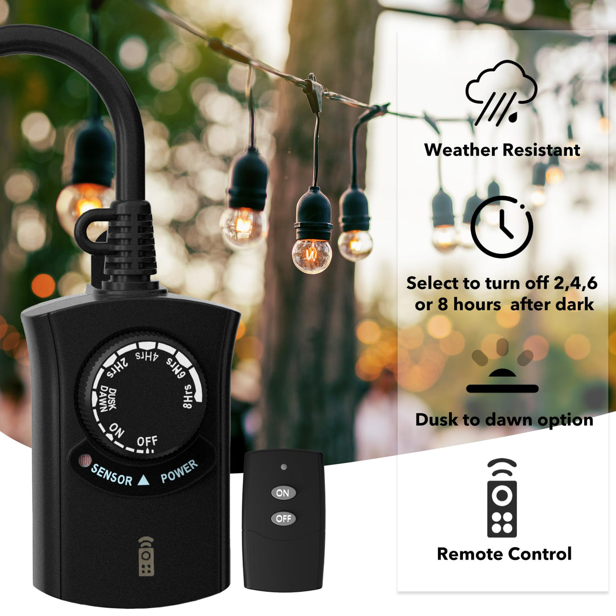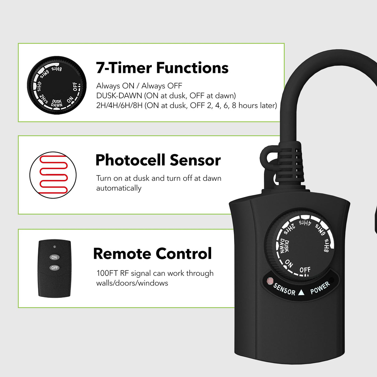 ✅【Multiple Timer Functions】Our outdoor light sensor timer offers versatile functionality with 4 countdown options (ON at dusk, OFF after 2/4/6/8 hours), 2 switch modes (always on/off), and 1 photocell sensor mode (ON at dusk, OFF at dawn). | ✅【Photocell Light Sensor】The built-in light sensor automatically detects dusk and darkness, turning your lights on and off without manual intervention. Perfect for controlling outdoor equipment such as garden lights, Halloween landscape lights, Christmas string lights, pool pumps, fountains, and more. | ✅【Space-Saving & Durable】The flat plug design saves space, making it ideal for crowded power outlets. The durable casing is resistant to sun and water damage. For optimal waterproof performance, please mount it vertically at least 2 feet above the ground. | ✅【Remote Control】This weatherproof outdoor timer includes a 6-inch cord and 1 grounded outlet. The remote control features a strong RF signal that can penetrate walls and doors, with a range of up to 100 feet in direct line of sight. | ✅【12-Month Warranty】Enjoy 1-year warranty and ongoing lifetime tech support. Our dedicated USA-based customer service team is ready to assist you with any questions or concerns.