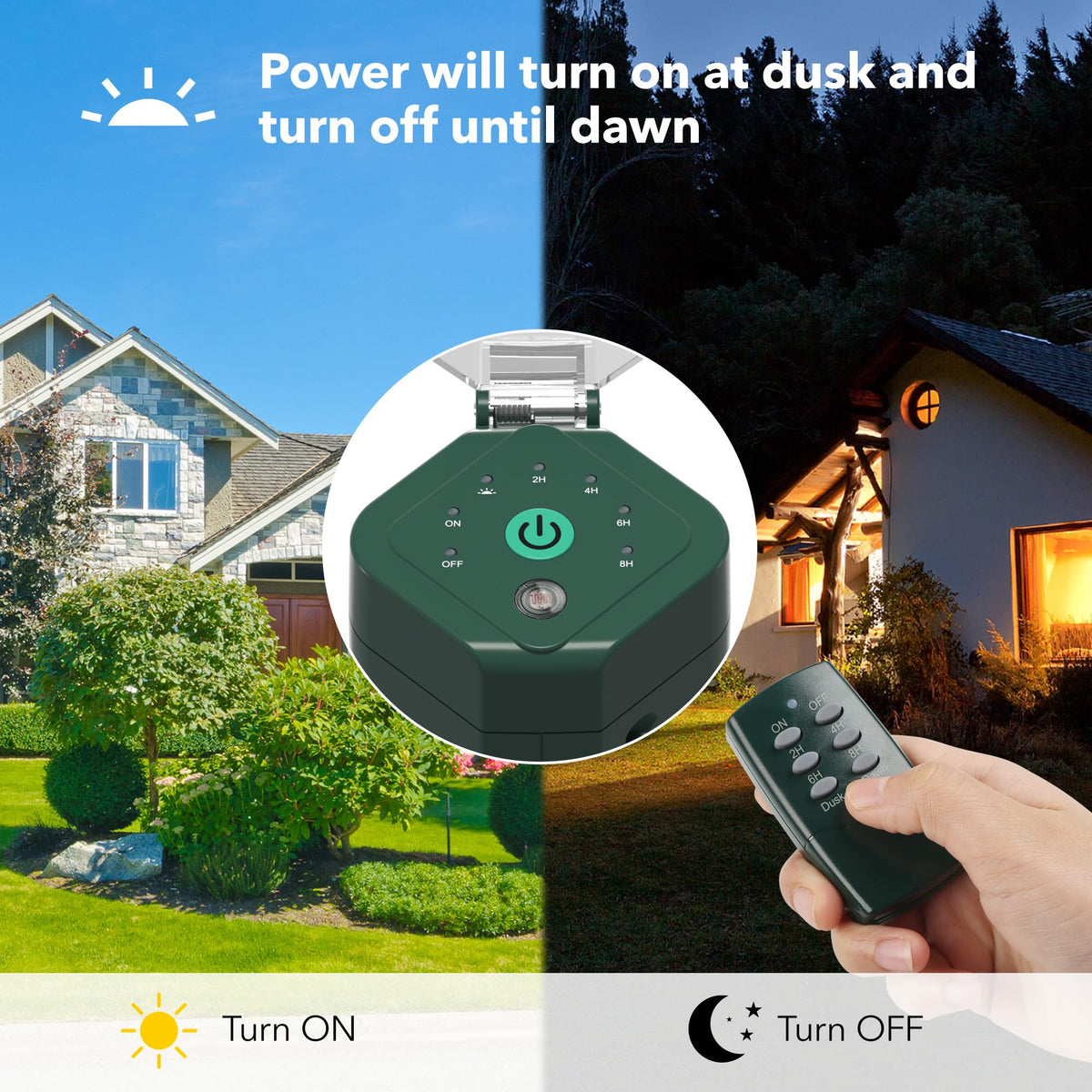 Q: How does the photocell light sensor work in the HBN Outdoor Power Strip Timer?A: The photocell light sensor in the HBN Outdoor Power Strip Timer detects the amount of ambient light outdoors. It automatically turns your connected lights on at dusk and off at dawn, ensuring your outdoor lighting operates efficiently without manual intervention.