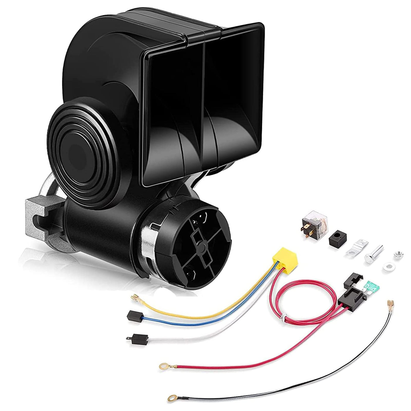 Package Includes: 1 X Air Horn 1 X Compressor 1 X Set Of Mounting Hardware 1 X Relay 1 X Wired Relay Plug 1 X Inline Fuse Holder 1 X Installation Manual