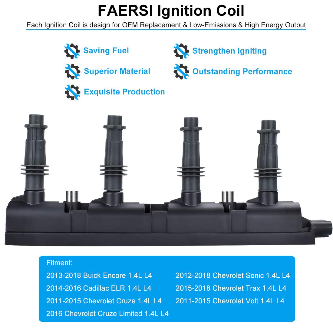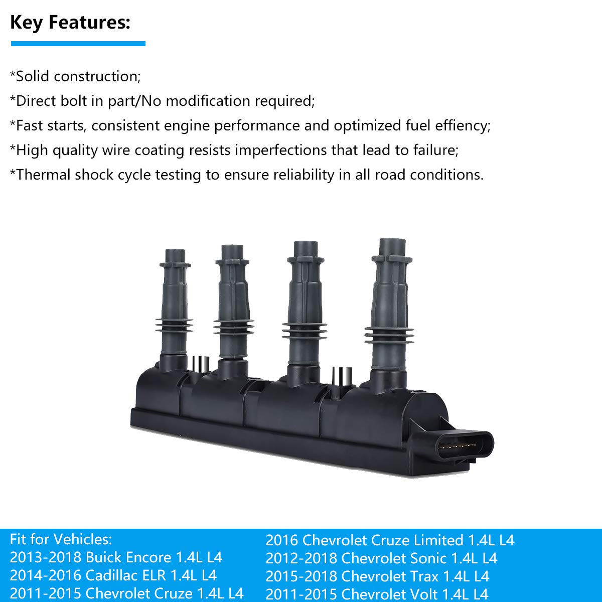 Oem Performance &Amp; Direct Installation &Amp; High Quality &Amp; Stronger Throttle Response Ignition Coils Produce The High Voltage Necessary To Ignite The Air/Fuel Mixture In The Combustion Chamber. When Not Replaced, Vehicle Could Experience No Or Hard Start, Long Crank Time, Misfire, And Catalytic Converter Failure. Our Products Are Inspected And Tested Multiple Times Before Sold, They Are Made To Match The Oe In Form, Fit And Function. Compatible With: 2013-2018 Buick Encore 1.4L L4 2014-2016 Cadillac Elr 1.4L L4 2011-2015 Chevrolet Cruze 1.4L L4 2016 Chevrolet Cruze Limited 1.4L L4 2012-2018 Chevrolet Sonic 1.4L L4 2015-2018 Chevrolet Trax 1.4L L4 2011-2015 Chevrolet Volt 1.4L L4 Replaces The Following Part Numbers: D521C, 55577898, 55579072, 25198623,55575499,25195707 Package Include: 1X Oem Performance Ignition Coil Pack