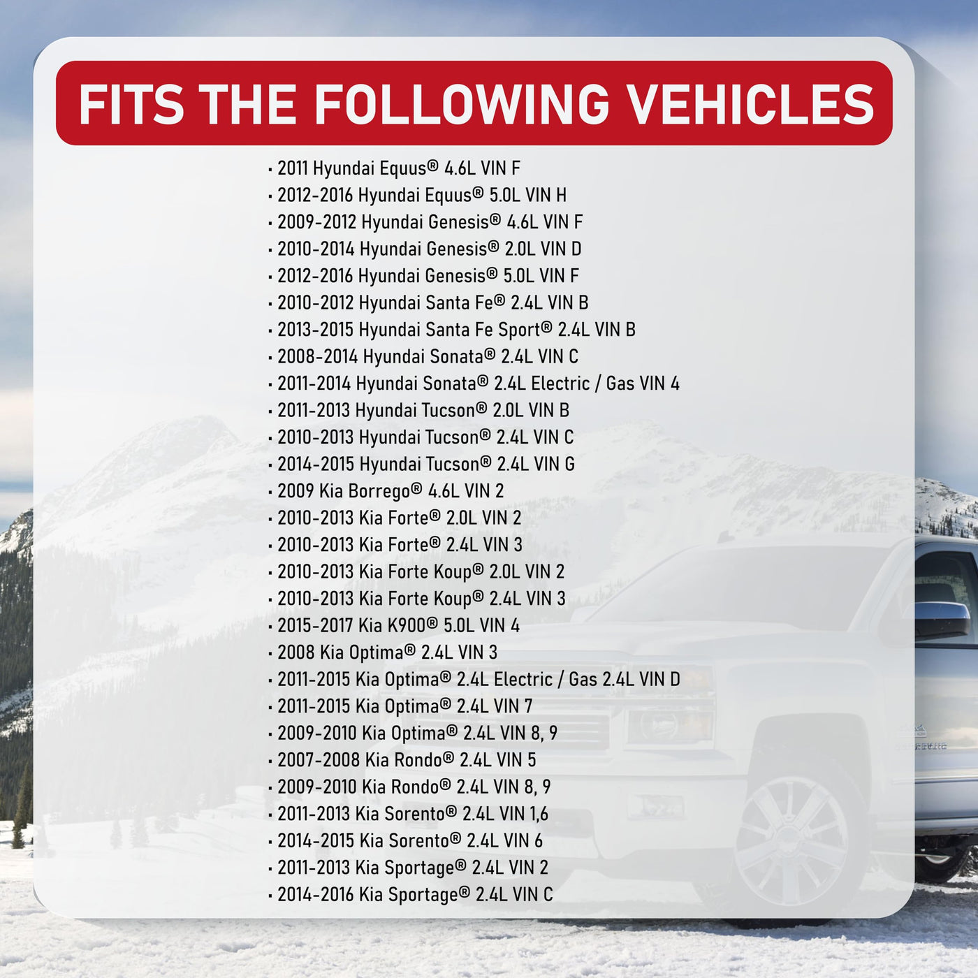 If your Equus, Genesis, Santa Fe, Santa Fe Sport, Sonata, Tucson, Borrego, Forte, K900, Optima, Rondo, Sorento, or Sportage has begun to misfire, idle erratically, or hesitate under acceleration, a bad coil pack could be to blame. By providing the proper spark to the spark plug, all of these issues can be resolved. This AA Ignition Coil Pack Set of 4 is a direct replacement for the factory coil. Made by an original equipment supplier (OEM). These coil packs surpass factory quality and return your engine to peak performance Compatible with the Following: 2011-2016 Equus All Engines 2009-2012 Genesis V8 4.6L 2010-2014 Genesis L4 2.0L 2012-2016 Genesis V8 5.0L 2010-2014 Genesis Coupe L4 2.0L 2010-2012 Santa Fe L4 2.4L 2013-2015 Santa Fe Sport L4 2.4L 2008-2014 Sonata L4 2.4L 2010-2015 Tucson L4 2.4L 2011 Tucson L4 2.0L 2012 Tucson All Engines 2009-2011 Borrego V8 4.6L 2010-2013 Forte All Engines 2015-2017 K900 V8 5.0L 2008-2015 Optima L4 2.4L 2007-2011 Rondo L4 2.4L 2014 Rondo L4 2.0L 2011-2015 Sorento L4 2.4L 2011-2016 Sportage L4 2.4L Replaces Part Numbers: UF-611, UF611, C1667, 5C1724 , E1111, 52-2079, IC712, 27300-2G000, 27300-3F100, 27301-3F100, C1669, 178-8353, CUF2153, PPCUF215, C-773, 2505-484790, IC611, 50130, 2-50130, 36-8182, 250130, 12153, 880320, 880407, 8010598, CU1526, JM5373 This is a compatible replacement part manufactured by AA Ignition. This ignition coil set is NOT a Standard Motor, Delphi, or Hitachi part. Vehicle makes and their associated vehicle models and part numbers are used in this listing only to identify the vehicles these ignition coil sets fit.