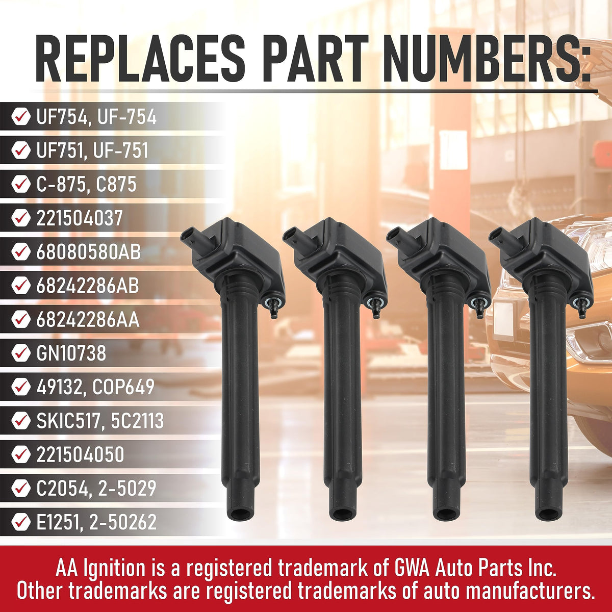 If your 200, Dart, 500X, Cherokee, Compass, Renegade or ProMaster City has begun to misfire, idle erratically, or hesitate under acceleration a bad coil pack could be to blame. By providing the proper spark to the spark plug all of these running issues can be resolved. This AA Ignition Coil Pack Set of 4 is a direct replacement for the factory coil. Made by an original equipment supplier (OEM) these coil packs surpass the factory quality and will get your engine running how it should be; smooth and fast. Compatible with the following L4 2.4L Engine: 2015-2017 200 2013-2016 Dart 2016-2018 500X 2014-2020 Cherokee 2018-2021 Compass 2015-2021 Renegade 2015-2021 ProMaster City Replaces Part Numbers: UF754, UF-754, 221504037, 68080580AB, 68242286AB, 68242286AA, UF751, UF-751, GN10738, 49132, C-875, C875, COP649, SKIC517, 5C2113, 221504050, C2054, 2-5029, E1251, 2-50262 This is a compatible replacement part manufactured by AA Ignition. This ignition coil set is NOT an OEM part. Vehicle makes and their associated vehicle models and part numbers are used in this listing only to identify the vehicles these ignition coil set fits.