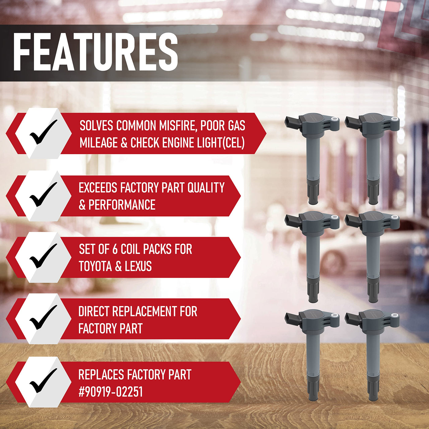 Ignition Coil Set Of 6 - Replaces 90919-A2007 - Compatible With Toyota, Lexus & Scion Vehicles - 2.7L, 3.5L V6 - Ignition Coil P