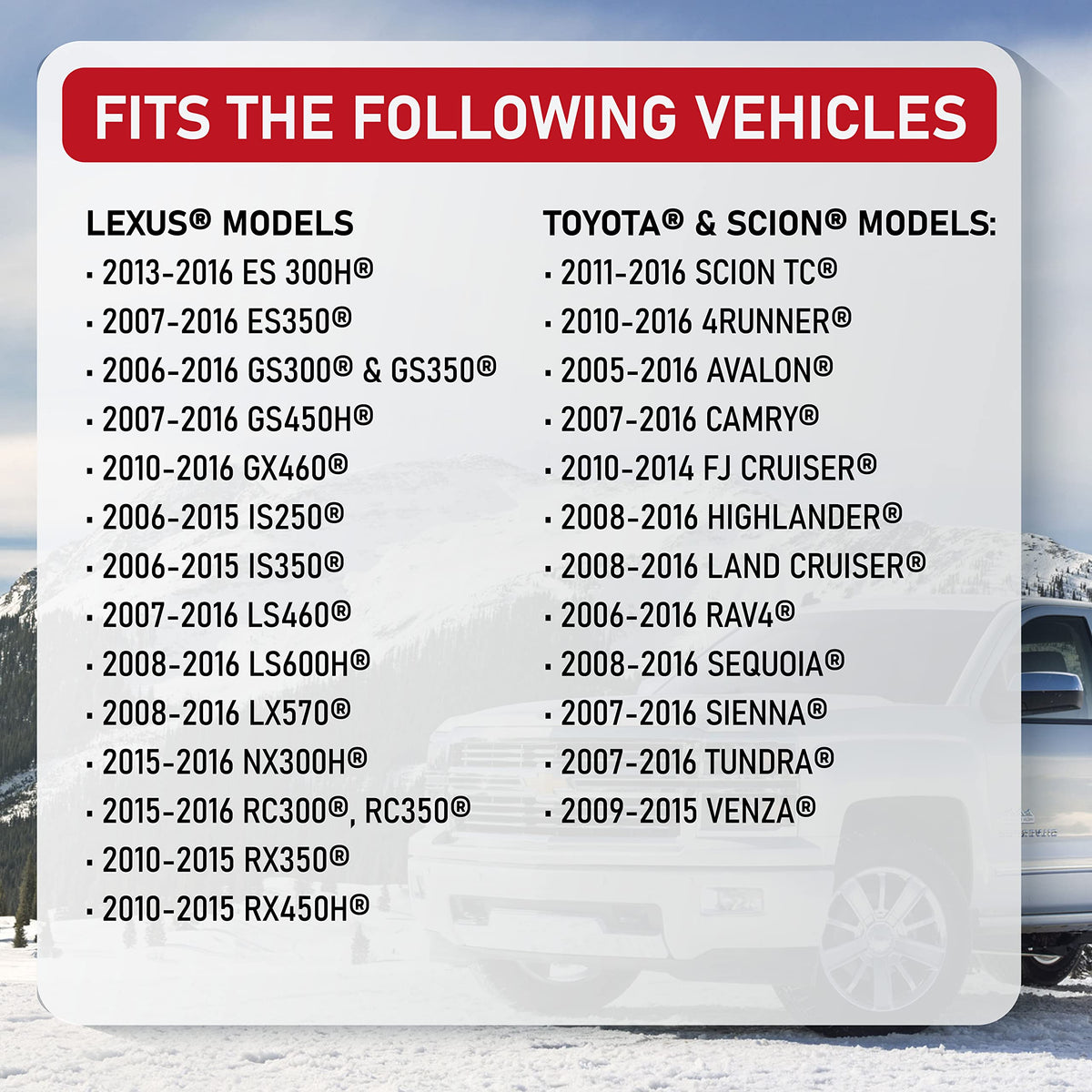 If your vehicle has begun to misfire, idle erratically, or hesitate under acceleration a bad coil pack could be to blame. By providing the proper spark to the spark plug all of these running issues can be resolved. This AA Ignition Coil Pack is a direct replacement for the factory or coil. Made by an original equipment supplier (OEM) these coil packs surpass the factory quality and will get your engine running how it should be; smooth and fast. This Ignition Coil Pack fits the following and Models: Models: 2013-2016 ES 300h 2007-2016 ES350 2006-2016 GS300 & GS350 2007-2016 GS450h 2010-2016 GX460 2006-2015 IS250 2006-2015 IS350 2007-2016 LS460 2008-2016 LS600h 2008-2016 LX570 2015-2016 NX300h 2015-2016 RC300, RC350 2010-2015 RX350 2010-2015 RX450h & Models: 2011-2016 tC 2010-2016 4Runner 2005-2016 Avalon 2007-2016 Camry 2010-2014 FJ Crusier 2008-2016 Highlander 2008-2016 Land Cruiser 2006-2016 RAV4 2008-2016 Sequoia 2007-2016 Sienna 2007-2016 Tundra 2009-2015 Venza Replaces the following part numbers: 90919-02251, 90919-A2002, 90919-A2004, 90919-A2005, 90919-A2007, Denso 673-1309, Delphi GN10366Manufactured by AA Ignition, exceeds the factory specification, and carries a 24 month or 24,000 mile warranty. The terms and are used in this listing only to identify the vehicles this ignition coil fits.