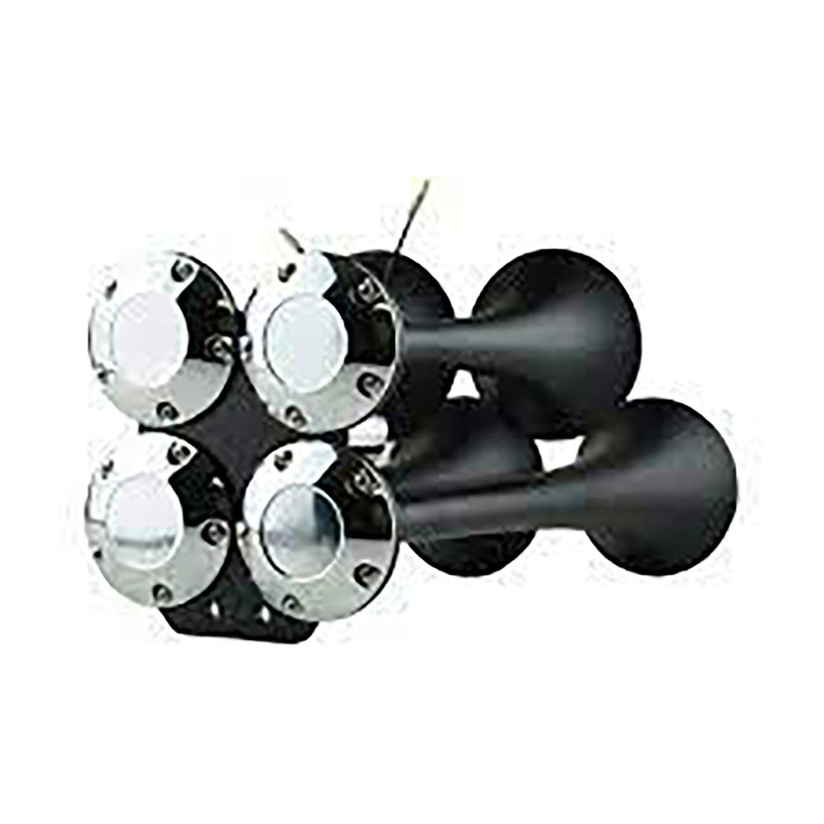 This 4-Way Train Horn Offers Off-Road Vehicles Or Trucks The Commanding Sound Of A Train Air Horn, Powered By A Heavy-Duty 12/24V Dc Electric Solenoid Valve. Its Trumpets Feature An Appealing And Resilient High-Quality Zinc Finish, And It Comes Complete With Mounting Hardware. With A Pressure Range Of 50 To 125 Psi And Overall Dimensions Of 6 X 6 X 14, It Ensures Both Impressive Performance And Durable Construction.