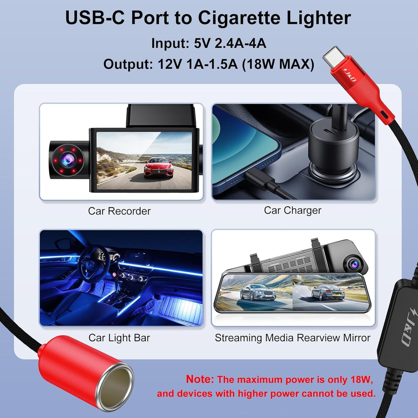 Q: What devices are compatible with the J&D USB C to 12V car cigarette lighter socket adapter?A: The J&D USB C to 12V car cigarette lighter socket adapter is designed for devices that consume 18W or less, including dash cams, GPS units, car LED light strips, and electronic speed radar detectors. It is not compatible with high-power devices such as car vacuum cleaners or refrigerators.