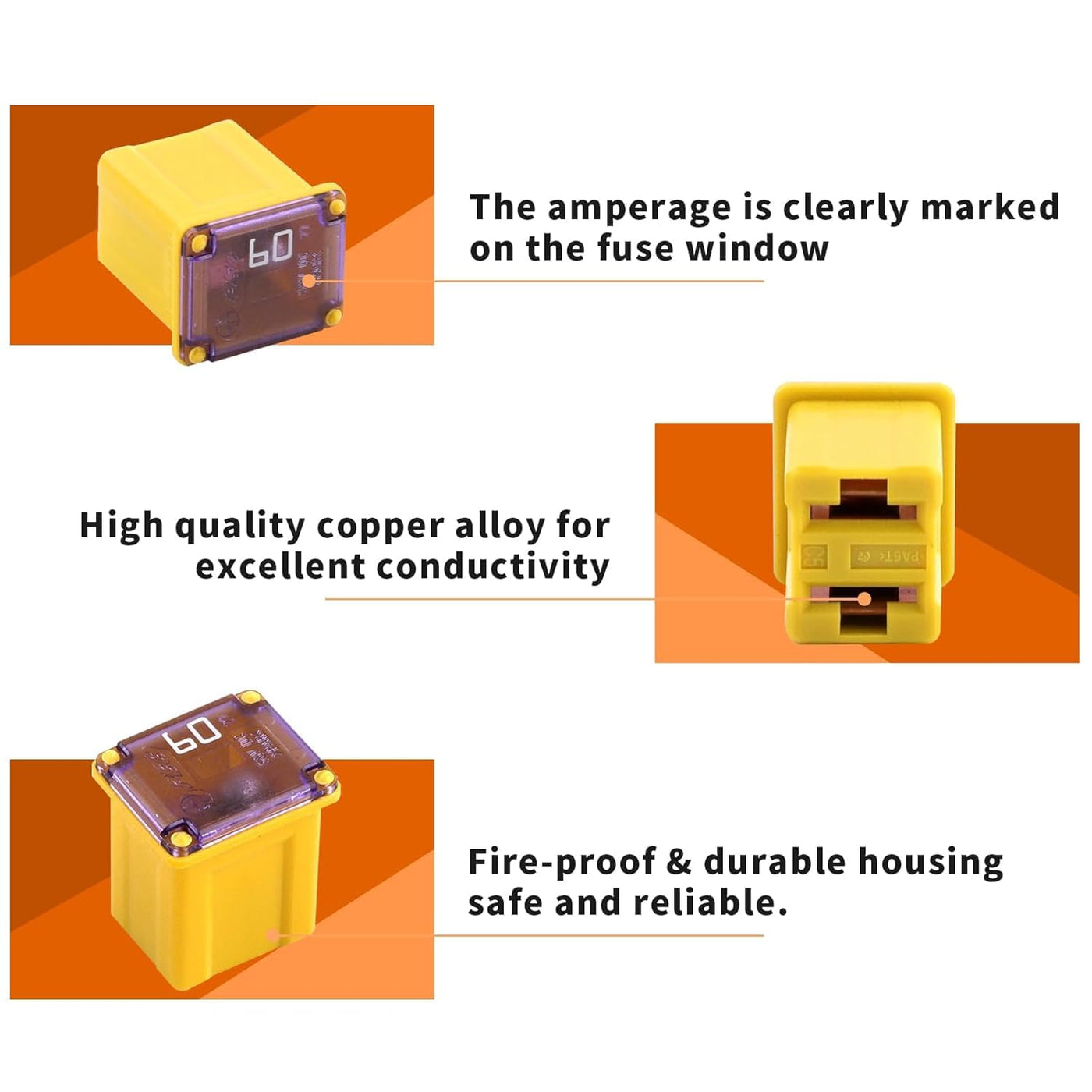 High quality! 100% Brand new! - Mmonly used replacement fuses for most vehicles. - Much cheaper than buying them at your local automotive store. - Nice to have lots of spare fuses if you have lots of equipment. - Perfect for any mechanic or repair shop. - If you've ever blown an auto fuse before & had to run to the hardware store for a single fuse, you know how much of a time saver this will be. ? Can be used for: Car,SUV,Truck,Motorcycle,Home,Boat,Camper RV,ATV Quad,UTV,Golf Car - Most electrical devices. ? Value list: - LOW PROFILE: 60A - 10pcs ?Tips: Make sure the picture fuse size is suitable for your car About returns policy and our services: 1.If you are not satisfied with our product or order wrong item, let us know at the first time, we will reply you in 12 hours. 2.If you are satisfied with our products, please don't forget to leave 5 stars Positive Feedback, we will appreciate your encourage.