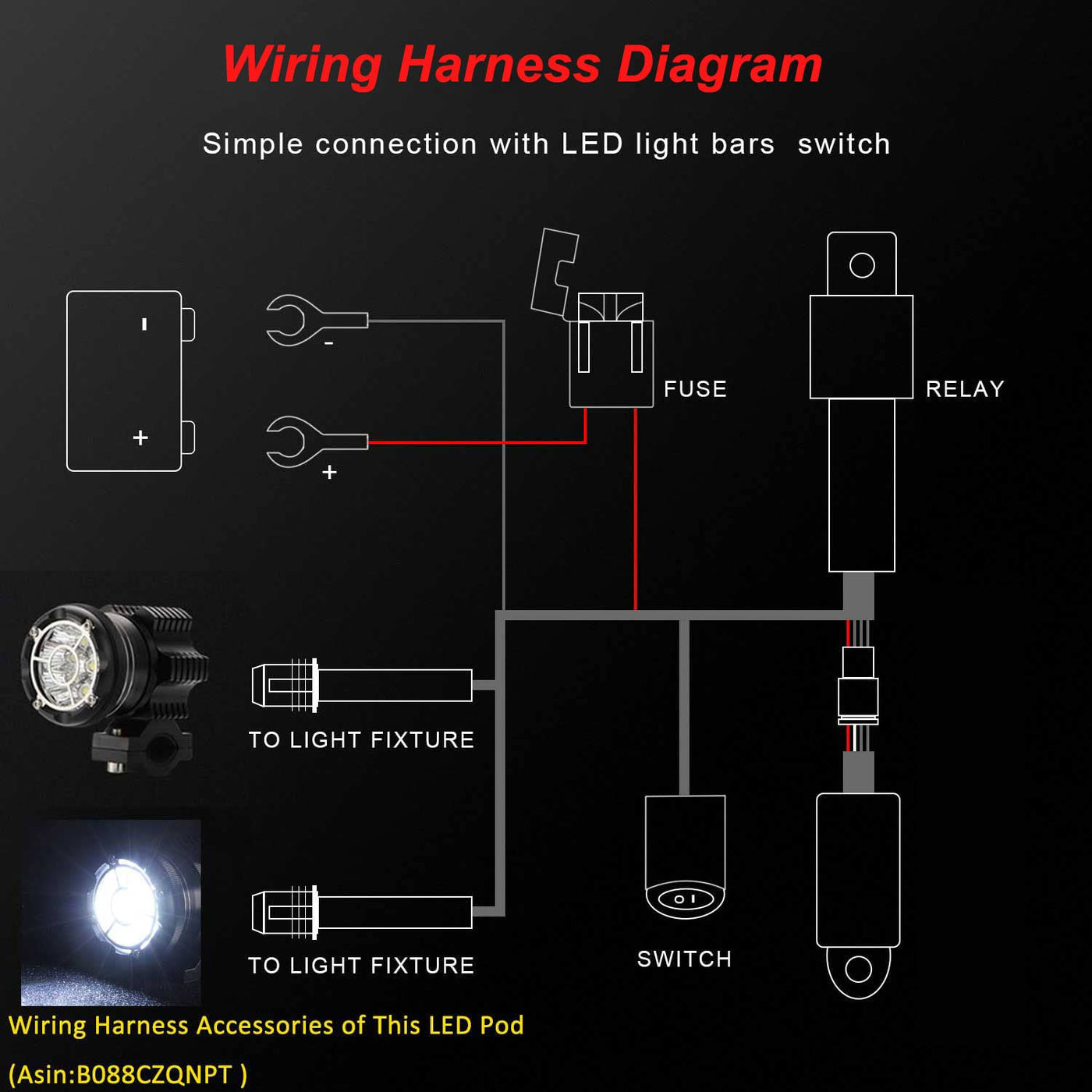 480W Led Light Bar Wiring Harness Features: 1.13Ft Universal Led Wiring Harness: Two Leads, One Line Group Can Control 2 Lights. Ip65 Waterproof Switch With Tape, Meet Your Needs For Mounting Your Lights Anywhere On The Vehicles. 2.New Upgraded Lighting Mode Switching Function,Once Turn Off Then On Again To Change The Light Mode 3.With 40A Relay And High Current Fuse, It Is Safe And Secure. 4.Automatically Turn Off The Light When The Voltage Is Lower Than 80% Of The Battery 5.Vehicle Start Induction: The Lights Can Only Be Turned On After The Vehicle Is Started 6.Mid-Range Voltage Monitoring: Real-Time Voltage Detection During Driving To Prevent Power Loss 7.Led Light Temperature Monitoring: Real-Time Monitoring Of Lamp Temperature To Extend Lamp Life Specifications: Operating Voltage: 12V Dc Max Working Current: 40A Max Wattage: 480W Wire Gauge: 14 Awg Material: Abs+Pc Weight: 1.3 Pounds Lifetime: Over 30,000H Note: Please Pay Attention To The Operating Circumstances. Keep Led Light Bar Wiring Harness Away From Any Moist Or Heat, Such As Rain, Moisture Environment, Electro-Heat Equipment (Engine And Etc). Applications: 1: The Wiring Harness Can Be Widely Applied To Off-Road Vehicle, 4X4, Atv, Utv, Suv, Truck, Motorcycles, Pick-Up, Van, Camper, Trains, Bus, Etc 2: The Led Wiring Harness Can Be Installed On Boat, Yacht, Skiff, Freighter And Ship To Enhance The Illuminating Brightness Of Voyage. Super Bright View Area And Excellent Visual Effect. 3:Light Bar Wiring Harness For Trailer, Forklift, Excavator, Dozer, Road Roller, Crane, Harvester, Grain Drill, Mower, Snowplow, Rescue Vehicle, Camping, Construction And Other Outdoor Lighting. The Amazingly Bright Light Make You See The Left And Right Clearly Package Included: 1 X 13Ft Led Wiring Harness 1 X Fuse 2 X Relay 1 X Waterproof Switch