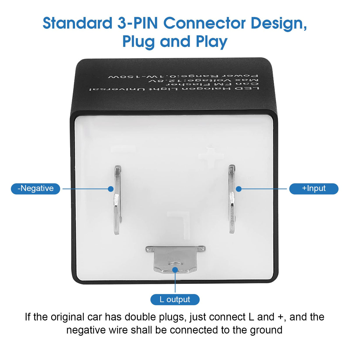 Features:- Superfine quality LED Flasher Relay universal for 12V 24V automobiles and motorcycles.- Flashing frequency of the turn light bulb allows to be adjusted.- Helpful in solving problems related to turn LED light, such as flashing, no flashing or burnt out.- Advanced SMD technology, with short circuit automatic protection, overload automatic protection, reverse connection automatic to guarantee the bulb's stable work.- Standard 3-PIN connector design, plug and play, simple installation, for long time use. Specification:Condition: Brand NewMaterial: ABS plasticColor: BlackVoltage: 12V 24VApplicable power: 0.1-150WSize: 5.3*3*2.6cm/2.1*1.2*1inFitment: Universal for automobiles and motorcycles Package List:1 * LED Flasher Relay Note:The original car with 3-PIN connector can use this product directly. If the original car has double plugs, just connect L and +, and the negative wire shall be connected to the ground.