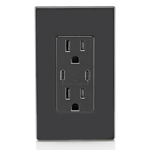 Leviton T5637-E 30W (6A) USB Dual Type-C/C in-Wall Charger with 15A Tamper-Resistant Outlet, USB Charger for Smartphones and Tablets, Not for Laptops, Black
