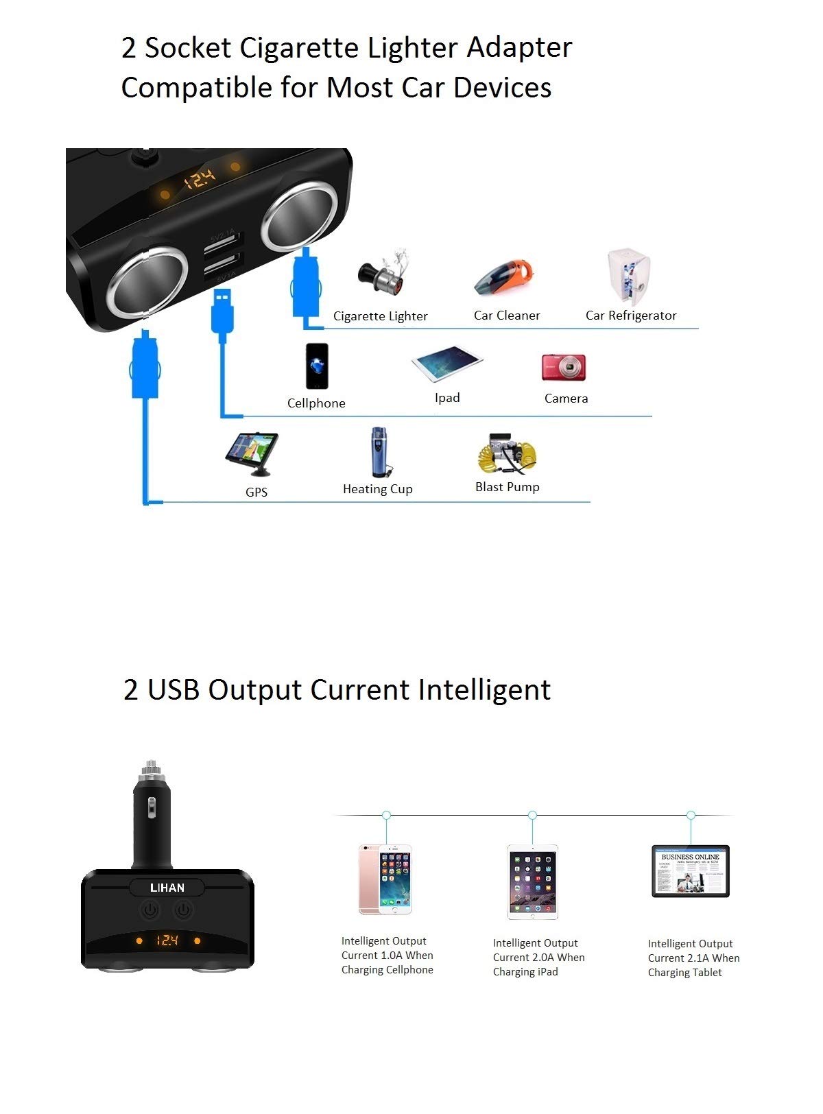 Lihan 2 Socket Cigarette Lighter Adapter, Car Charger Plug Splitter With Dual Usb Ports, 12V/24V Meter Monitor, Compatible With