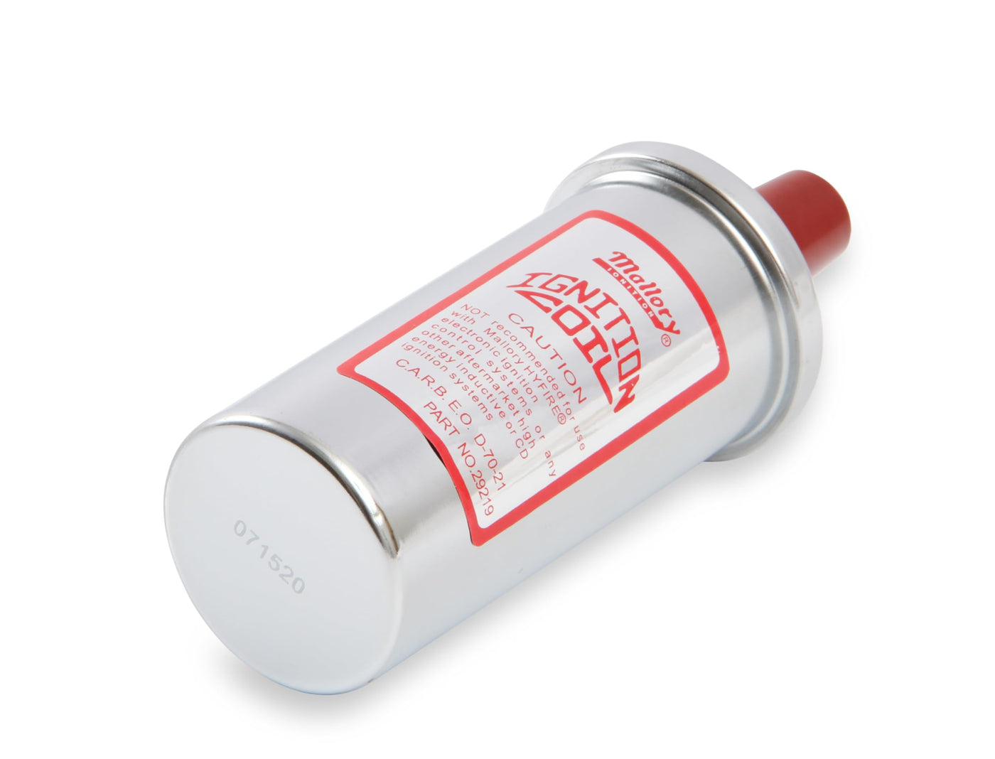 Q: What vehicles is the Mallory Universal Chrome Canister Ignition Coil compatible with?A: The Mallory Universal Chrome Canister Ignition Coil is designed to work with various vehicles, particularly those utilizing Magnetic Breakerless (MBI) Distributors and conversion kits. It is suitable for performance ignition systems in classic Ford models and other compatible vehicles.