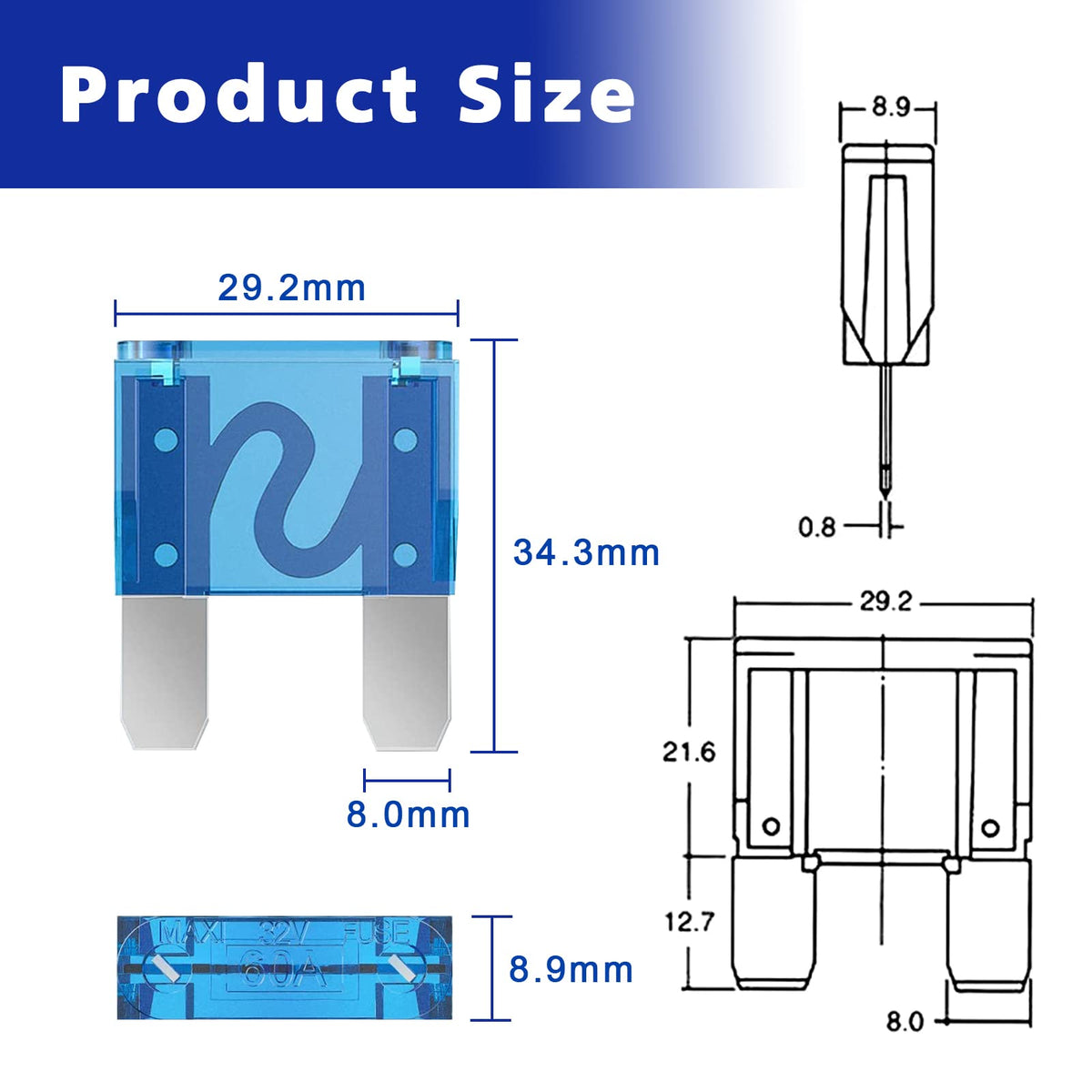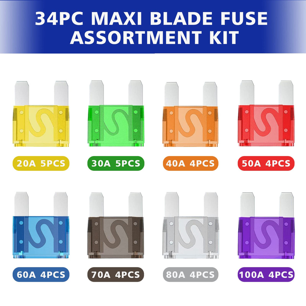 Q: How many fuses are included in the Maxi Blade Fuse Kit and what are their amperage ratings?A: The Maxi Blade Fuse Kit includes a total of 34 pieces with the following amperage ratings: 20A (5 pieces), 30A (5 pieces), 40A (4 pieces), 50A (4 pieces), 60A (4 pieces), 70A (4 pieces), 80A (4 pieces), and 100A (4 pieces).