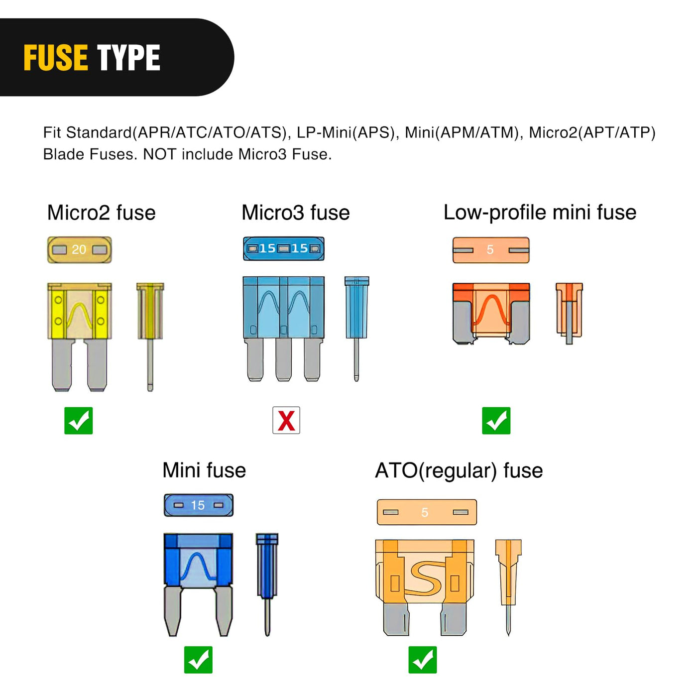 Q: What types of fuses are included in the Nilight 24 Pcs 12V Car Add-a-Circuit Fuse Tap Holder?A: The Nilight fuse tap holder includes 6 Standard fuse taps, 6 Mini fuse taps, 6 Micro2 fuse taps, and 6 Low Profile mini fuse taps, totaling 24 fuses in various types for versatile applications.