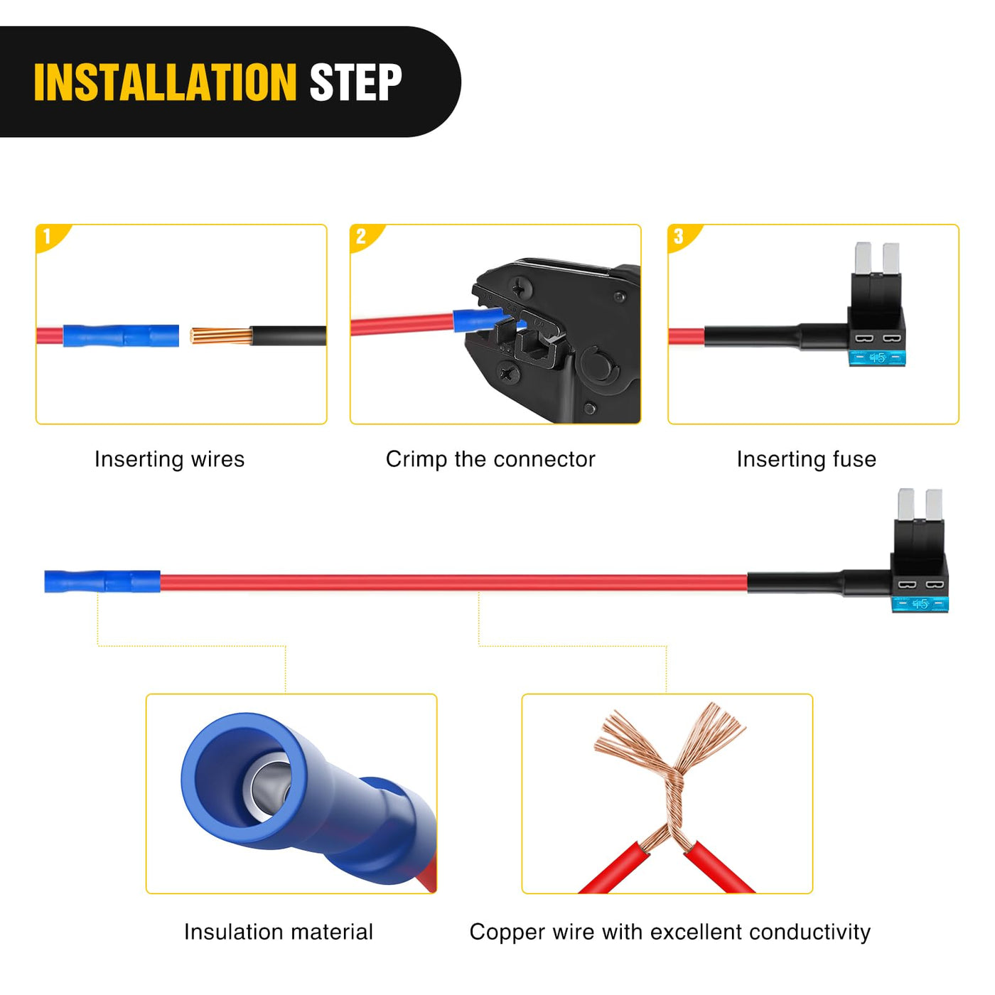 Q: How do I install the Nilight fuse tap holder in my vehicle?A: Installation is straightforward; simply plug the fuse tap into an occupied or vacant slot in your vehicle's fuse block. This allows you to add additional circuits without the need for splicing or cutting wires.