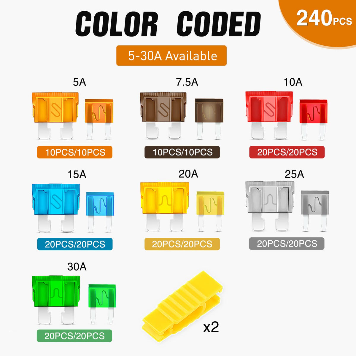 Nilight - 50018R 240Pcs Standard And Mini Blade Fuses Set,5A 7.5A 10A 15A 20A 25A 30A Atc Apr Ato Ats Standard And Atm Apm Mini