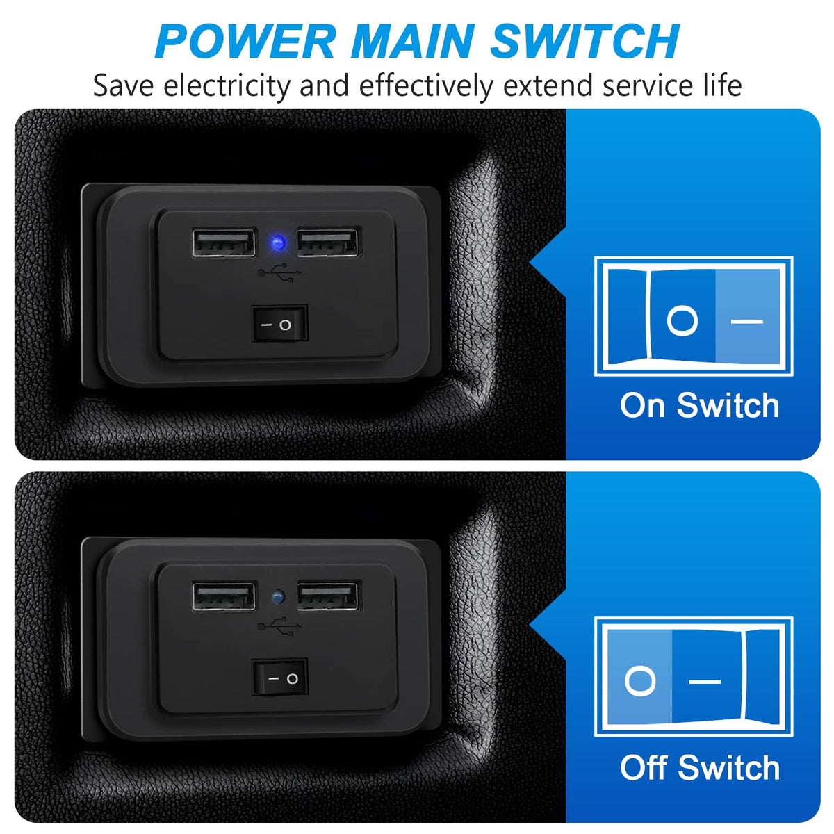 Q: What safety features does the ON/OFF Switch RV USB Outlet offer?A: This USB outlet is made from ABS flame retardant material and includes a power switch to save energy and extend device lifespan. Additionally, it has built-in protections from overload, overheating, and short circuits for safe use.