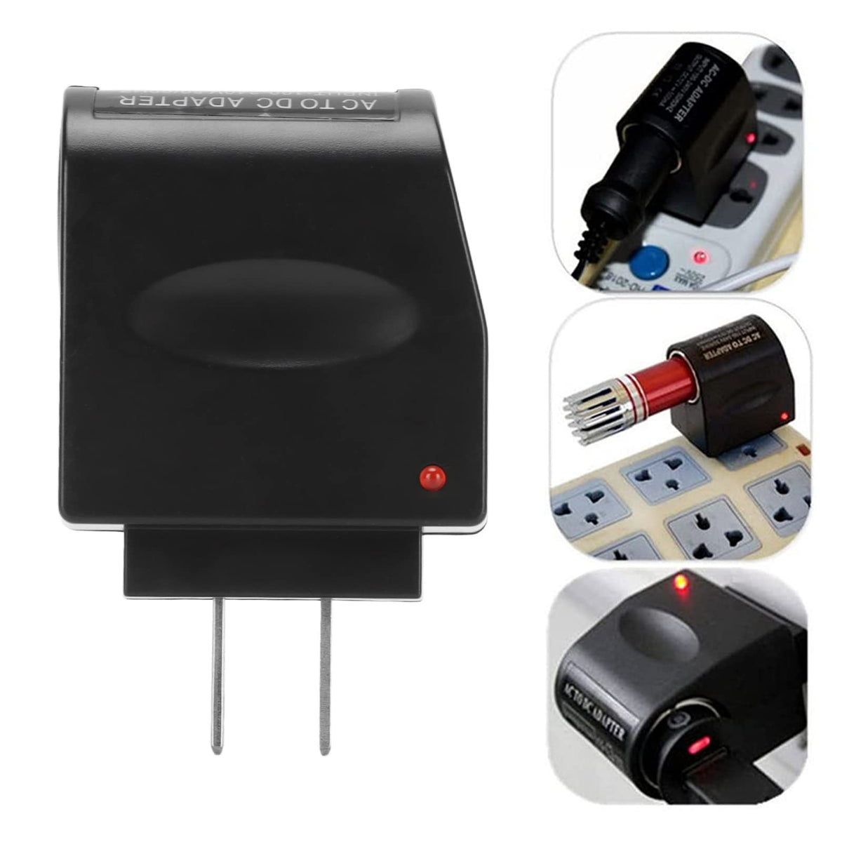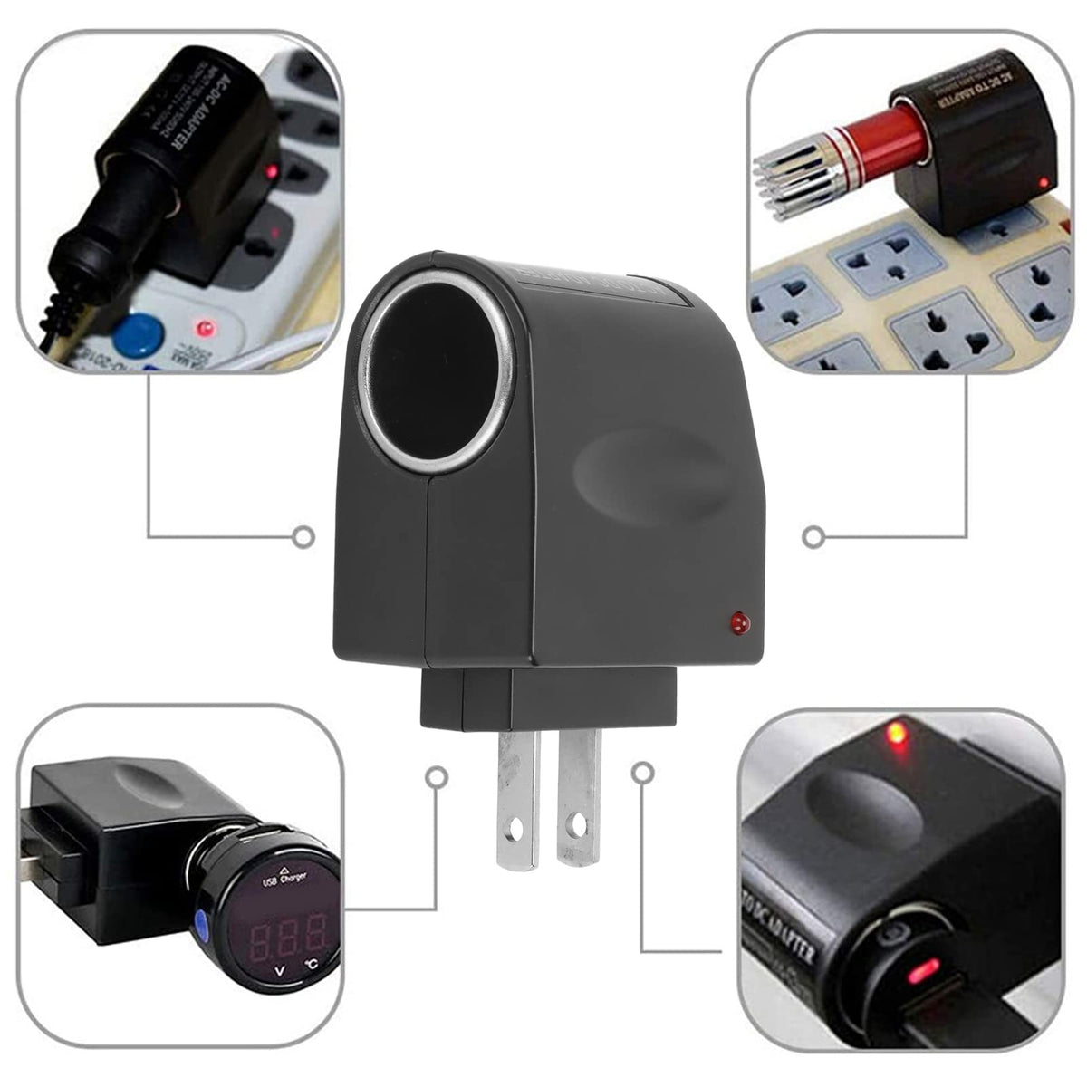 Q: How does the car cigarette lighter adapter work?A: The car cigarette lighter adapter converts standard household AC power (100-240V) to 12V DC power, allowing you to power your 12V car products directly from a wall socket.