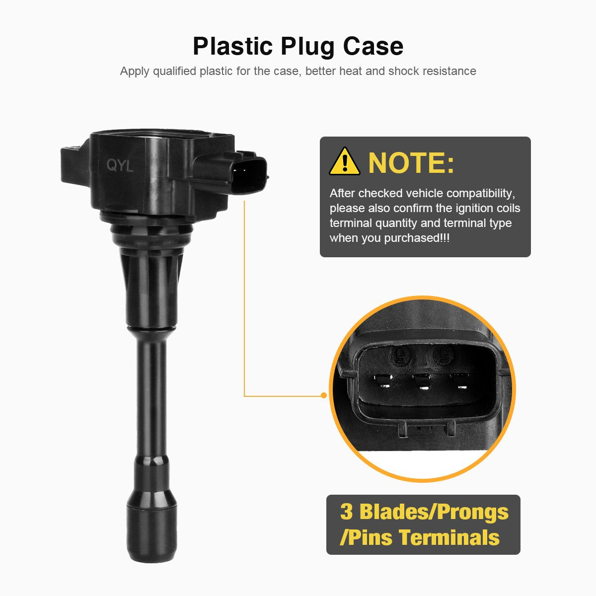 Q: What vehicles are compatible with the QYL Ignition Coils?A: The QYL Ignition Coils are compatible with various models including Nissan Altima, Cube, Sentra, Rogue, NV200, Pathfinder, as well as Infiniti FX50, M56, and QX60. To ensure compatibility, please enter your vehicle details in your Amazon Garage.