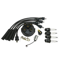 Q: What components are included in the complete tune-up kit?A: The complete tune-up kit includes essential components such as points, a condenser, rotor, spark plugs, a clip-held cap, a custom spark plug wire set, and four 386 plugs. This comprehensive kit ensures your tractor runs efficiently.