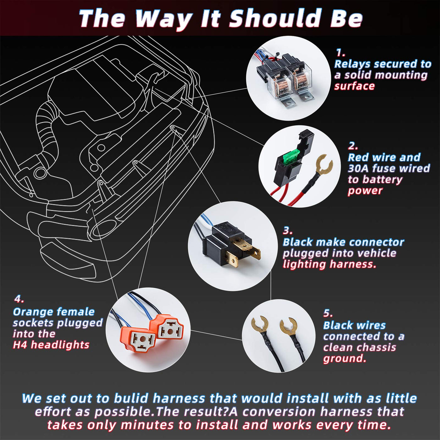 This h4 relay harness repair: -Dim Headlights -Back Feeding Power -Flickering Headlights -Malfunctioning Headlights when using Hi/Low Beams -Overloading the Headlight Switch -Overheating Plugs If you suffer from problems(,such as dim headlights, malfunctioning headlights) when replacing halogen lights to 7x6/h6054 led healdights, you need buy this h4 relay harness to fix those issues