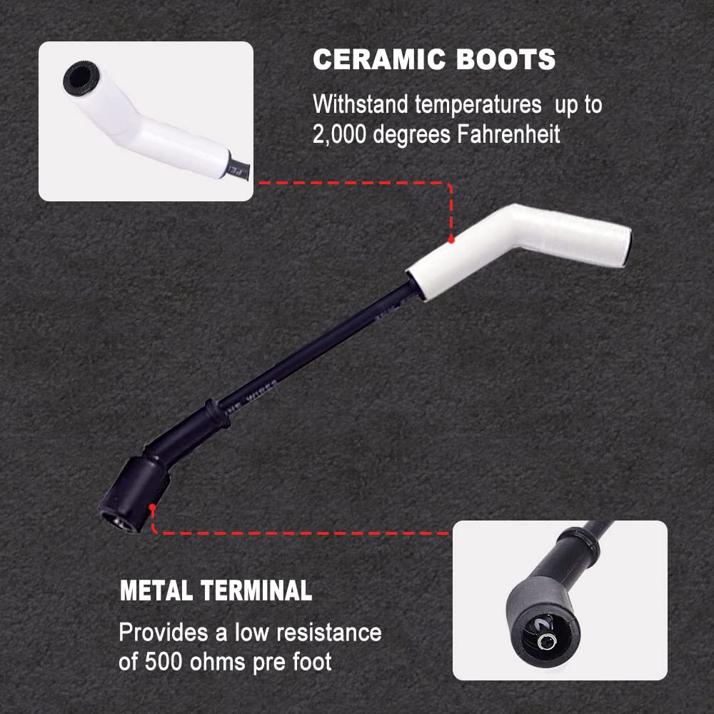 Q: What makes the Extreme 9000 Ceramic Boot spark plug wires unique?A: The Extreme 9000 Ceramic Boot spark plug wires are designed to withstand extreme temperatures, with ceramic boots that can endure up to 2,000 degrees Fahrenheit. They also feature stainless steel terminals for maximum spark energy and a low-resistance core for effective RFI/EMI suppression.