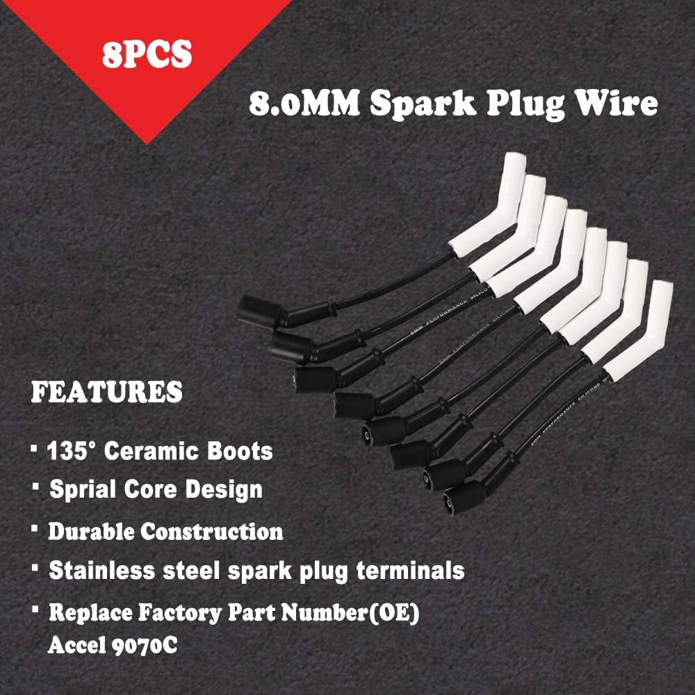 Q: What vehicles are compatible with the RLP Spark Plug Wire Set Accel 9070C?A: The RLP Spark Plug Wire Set is compatible with a variety of Cadillac, Chevy, and GMC vehicles, including 2005-2008 models such as the Buick Rainer, Cadillac CTS, Chevy Corvette, and GMC Sierra. For a complete list, please refer to the product description.