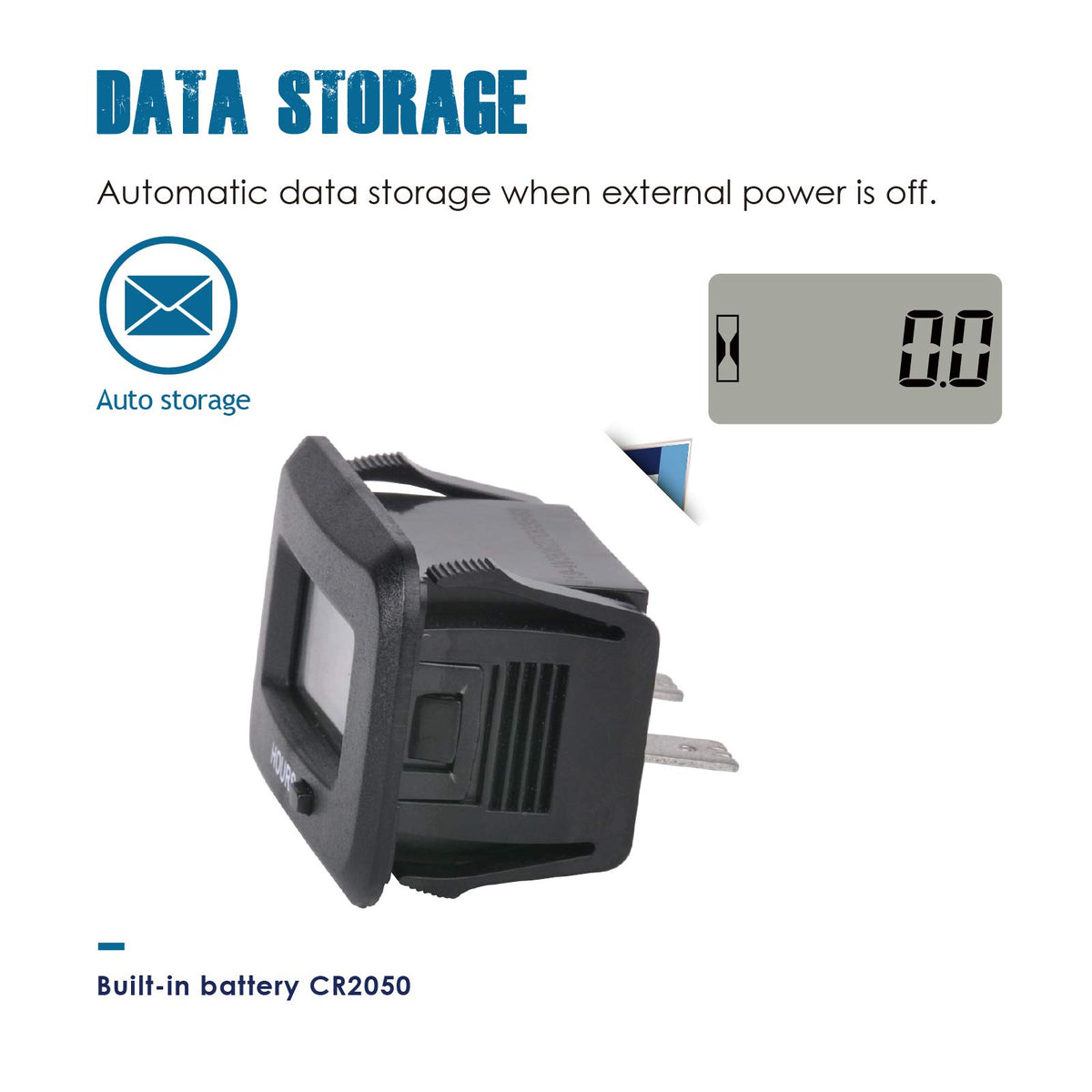 Q: What kind of battery does the hour meter use and how long does it last?A: The hour meter is powered by an internal CR2050 battery, which offers a lifespan of up to 6 years, with data retention for over 25 years, ensuring that your recorded hours are maintained even when the power is off.