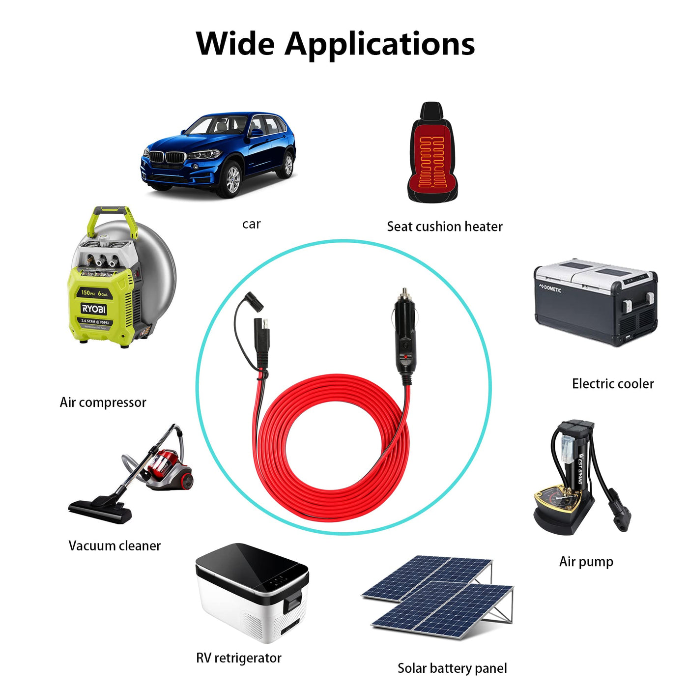 Q: What devices can I charge using the SinLoon Cigarette Lighter SAE Battery Charger Cable?A: The SinLoon Cigarette Lighter SAE Battery Charger Cable is versatile and can be used to charge various devices including cars, motorcycles, 12V hand-held chain saw sharpeners, air compressors, tire inflators, electric seat warmers, RV refrigerators, car TVs, and vacuum cleaners.