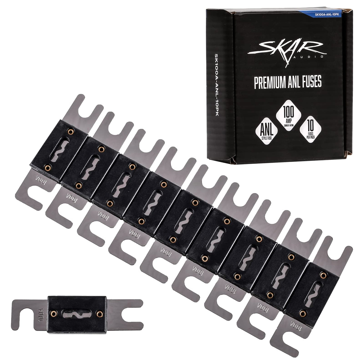 Skar Audio 100 Amp ANL fuses are engineered to ensure the fusing in your electrical setup delivers maximum power, safety, and reliability. Protect your equipment with these high quality, nickel plated, 100 Amp ANL fuses. Sold as a 10 pack (1 box containing 10 ANL fuses).