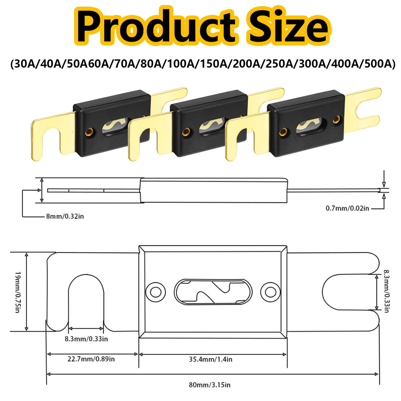 ?Specifications? - Color:Gold - Material: 30A-80A Gold-plate,100A-500A Pure copper - Size: 80x22x8mm/3.15x0.87x0.32inch - Current:30A/40A/50A/60A/70A/80A/100A/150A/200A/250A/300A/400A/500A -Package: 6pcs ANL inline fuse ?Features? - These inline fuse will protect your controller, wire, and battery from overcurrent,suitable for auto car, boat ,truck audio video systems or other vehicles. - Made of copper alloy and gold plating on the surface, durable and reliable to use, heat resistant, melting resistance and good conductivity, good material can ensure you long lasting use. ?Notice? - Please replace an ANL fuse with an ANL fuse of the same amperage.
