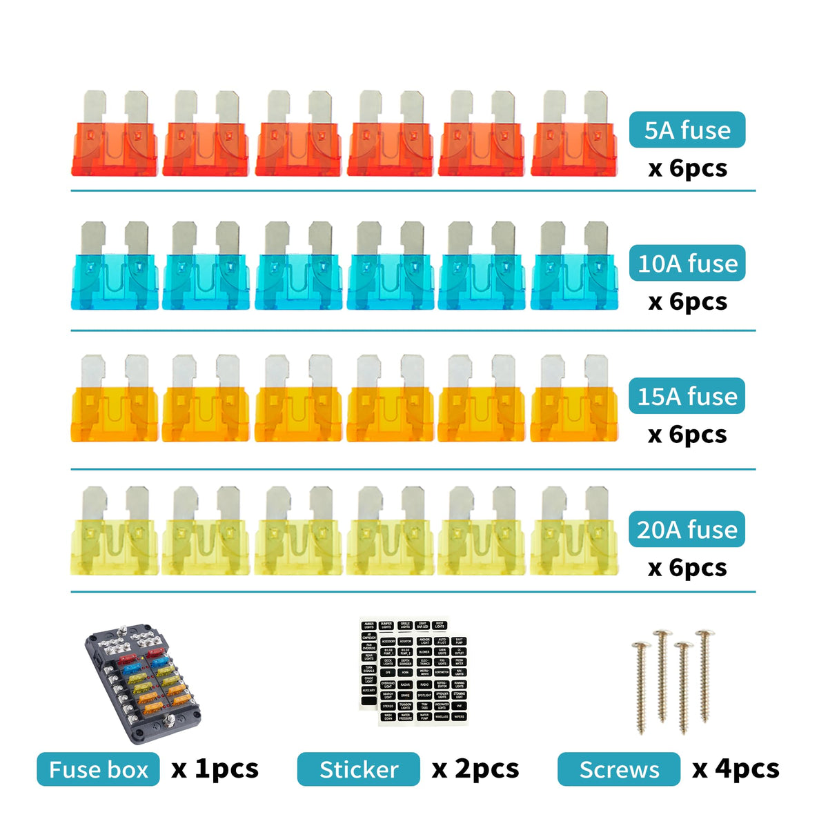 Q: What types of fuses are included with the SOYOND 12-Circuit Fuse Box?A: The SOYOND 12-Circuit Fuse Box includes various fuses: 20A fuses (6), 15A fuses (6), 10A fuses (6), and 5A fuses (6), along with OT terminals, labels, and screws for installation.