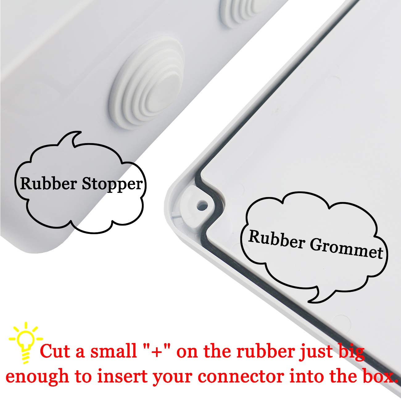 To ensure optimal waterproof performance, it’s vital to follow some installation tips: make sure the rubber grommet is properly sealed around the lid and that the rubber stoppers are tightly secured. If you need to cut a hole for cable entry, we recommend using glue to secure the rubber stopper to prevent any looseness caused by cable pulling.