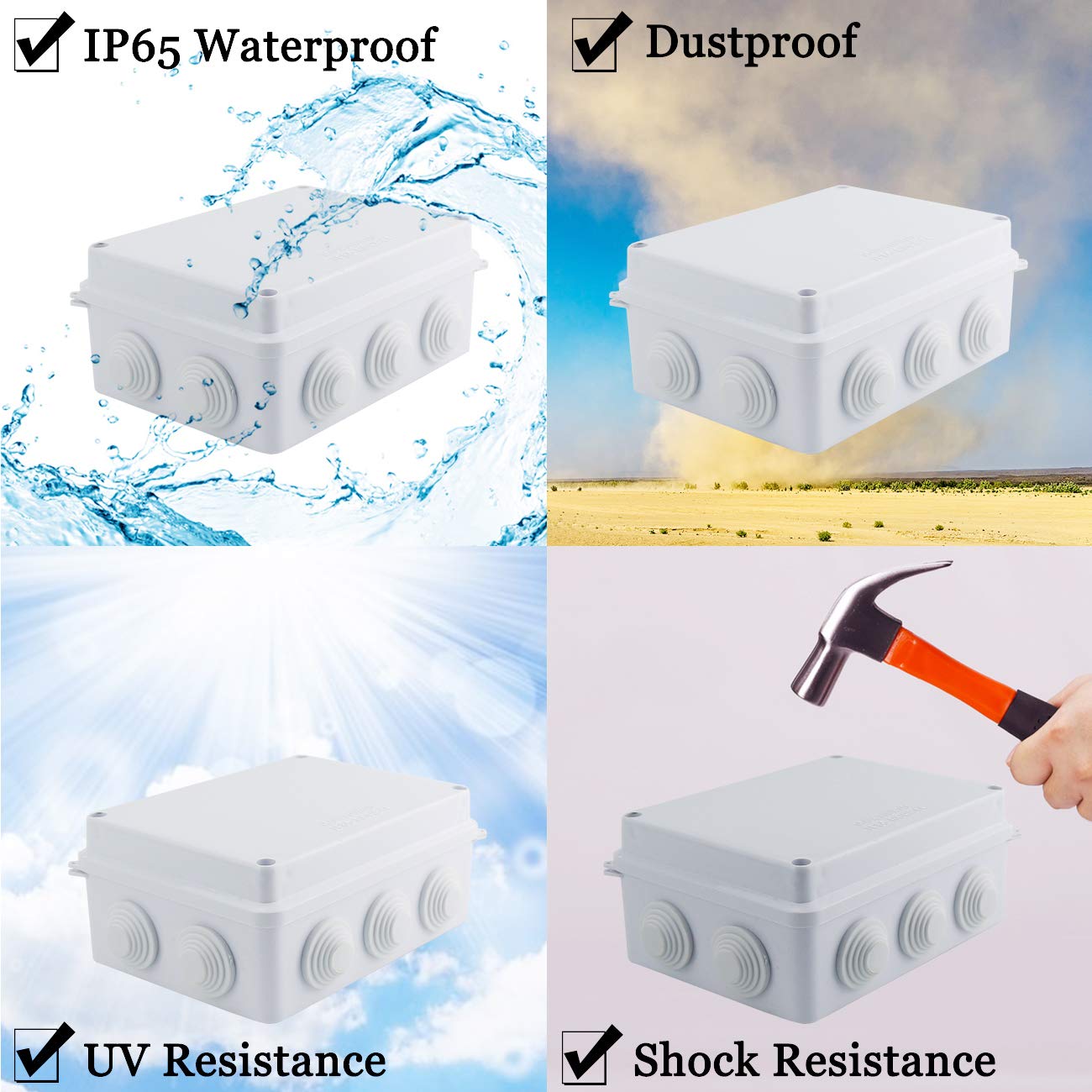 Q: What materials are used in the construction of this electrical junction box?A: This junction box is made from high-quality ABS plastic and rubber, ensuring durability and resistance to harsh environmental conditions.