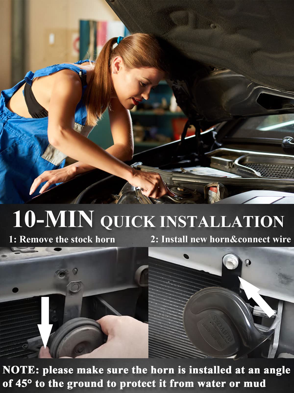 Q: How easy is it to install the SYOAUTO Car Horn?A: The installation process is straightforward and can be completed in about 10 minutes. The horn kit is no polarity, but it's important to mount it with the horn mouth facing down to prevent mud accumulation.