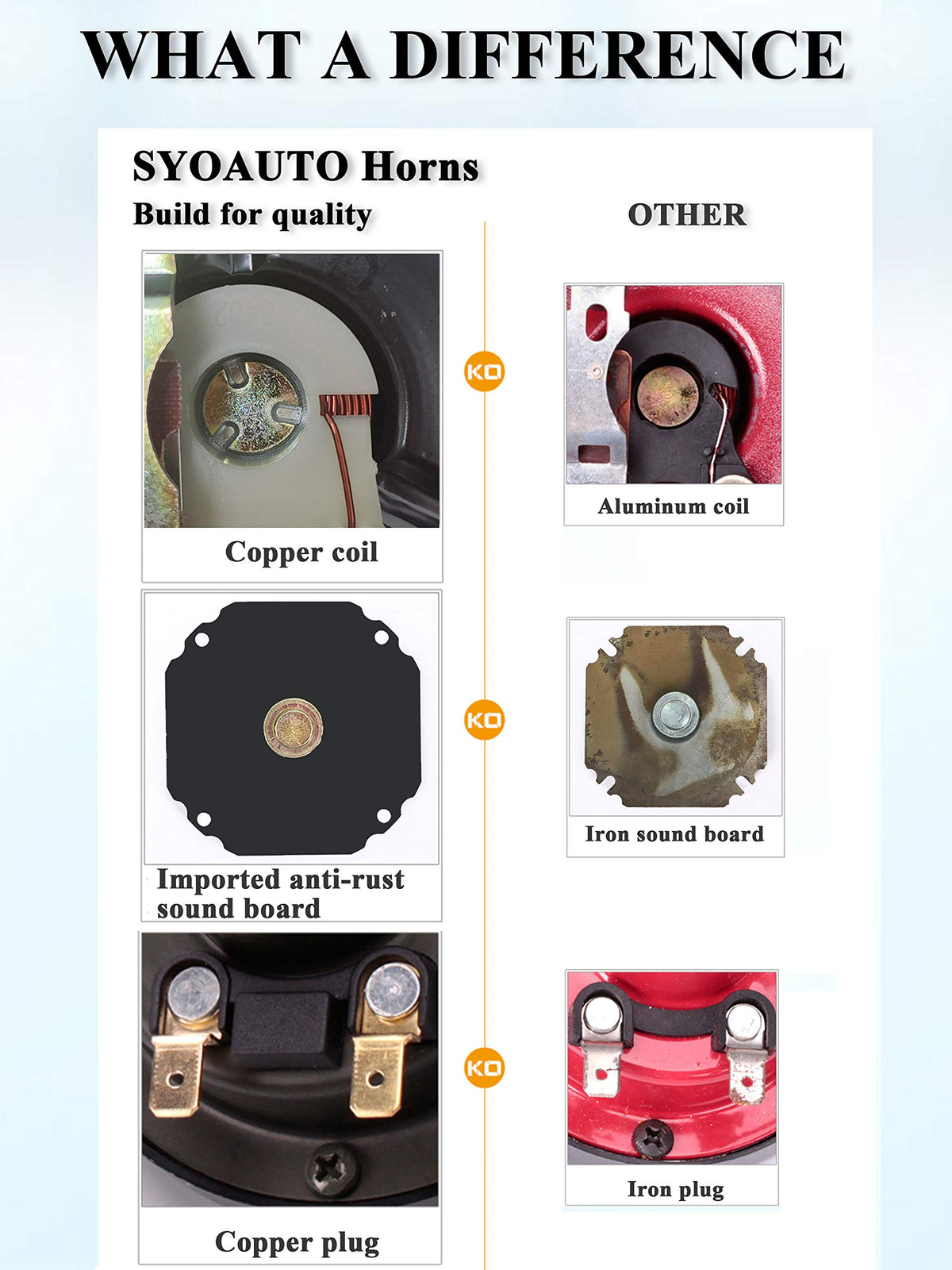 Q: What materials are used in the construction of the SYOAUTO Car Horn?A: The SYOAUTO Car Horn features a high-quality design with a pure copper spiral coil and an ABS engineering plastic shell, ensuring durability and a long lifespan.