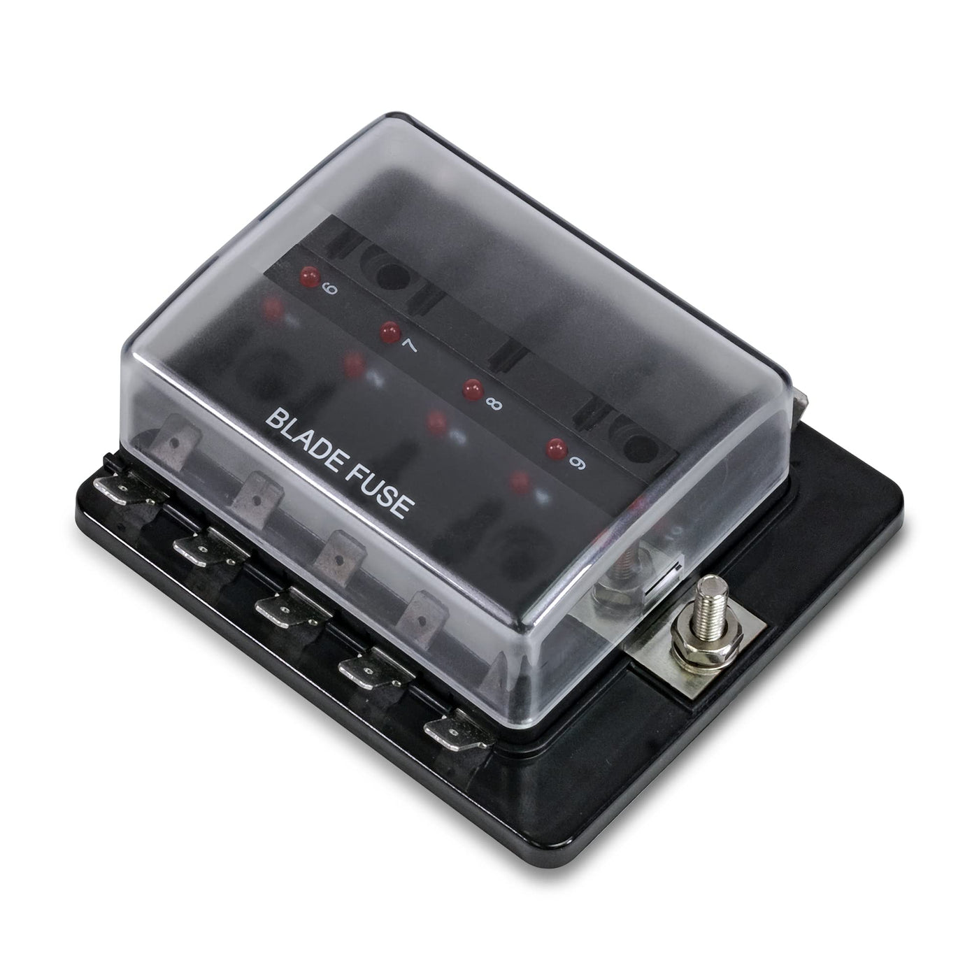 This 10 way ATC/ATO blade fuse holder box is compact, yet rugged in construction. LED illuminated, the red LED indicator light allows you to quickly diagnose which of the fuse has “popped”. This fuse panel has a #10-32 stud for power feed, .250” male quick disconnect terminals, can take an input voltage of 10 – 32 V DC, can handle a maximum of 30 Amp per circuit with a maximum of 100 Amp per panel, and has a cover for additional protection.Interchangeable/Compatible with:All automobiles and devices equipped with a 10-32 Volt DC power source.Features:High quality construction.Red LED illuminates when fuse is blown.Maximum of 30 Amp per circuit and 100 Amp per panel.Clear cover included for additional protection.Product Content:1 x Fuse Box with Cover1 Year Manufacturer WarrantyHave a Question? Call Us Toll Free 1-855-LED-ONLINE (1-855-533-6654)