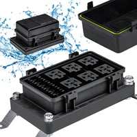 REMAP YOUR WIRING - organize, consolidate, and keep track of multiple independent circuits with six relay sockets and six fuse holders. | MULTI-TRERRAIN - Our unique 'Z' shaped brackets make it possible to securely mount this waterproof relay box just about anywhere. | BUILT LIKE A TANK - Made from durable and dependable nylon 66 and sporting an IP65 waterproof rating, our relay box dosent understand the word 'can't.' | A COMPLETE KIT - Box, brackets, seals, terminals, we've included everything you will need to sucessfully install your new waterproof relay box. | MORE THAN A WARRANTY - We've got you covered with an industry leading two-year warranty and the best customer support in the business.