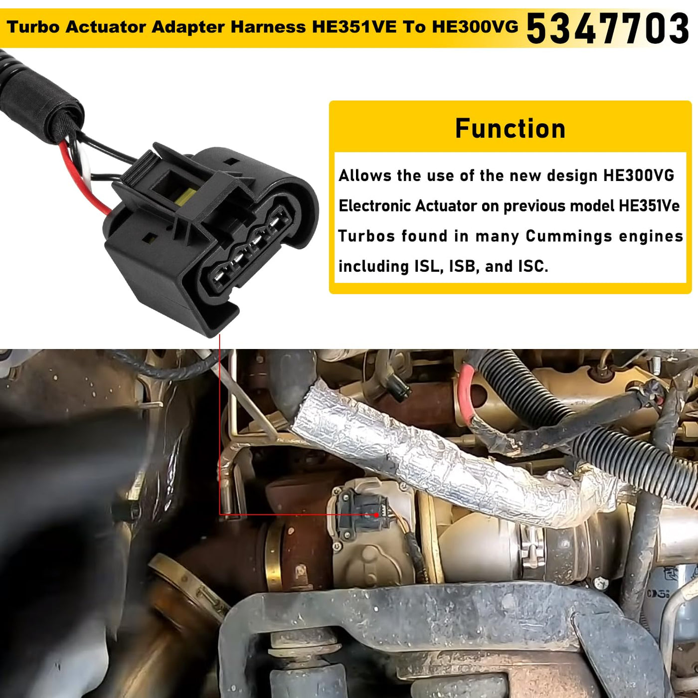 actuator Adapter Harness For Dodge Ram Truck ISB 6.7 Holset HE300Vg HE351Ve 5347703Application- For Dodge 6.7 CumminsTurbocharger Model- HE300VG / HE351VEContents- (1) Adapter HarnessFunction- This adapter harness allows the use of the new design HE300VG Electronic Actuator on previous model HE351Ve Turbos found in many Cummings engines including ISL, ISB, and ISC. - For example, it allows the 07.5-12 Dodge Ram 6.7L Cummins to run the updated turbo actuator (4034309H) that is used on 2013+ Rams VGT Turbochargers.