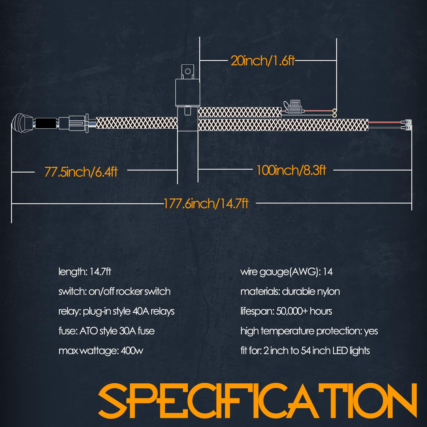 Nirider LED lights and accessories are designed and built to be tough, built to last and built with the absolute commitment to quality. Our mission is to design premium unique products that illuminate lifes adventures. FEATURES Durable, waterproof, high temperature resistance Designed to handle the harshest environments Nylon jacket offers superior strength and flexibility SPECIFICATION Total cable length: 177.6inch/14.7ft Material: durable nylon Lifespan: 50,000+ hours Ip68 compliant: dust / water ingress Operating voltage: 12-14V DC Operating temp: -40? to 200? Certified by CE & ROHSQuality assurance: 12 MONTHS Fit for: most of LED lights APPLICATIONS This universal product can be installed in any location you see fit so that no matter what make and model you drive. Fit for pickups, trucks, cars, SUVs, 4x4, ATV, UTV, boats, and all your favorite off-roading vehicles. It can be used on driving lights, fog lamps, search lights, work lights, off road lights, backup reverse lights and more. BOX COME WITH 1 lead nylon wiring harness illuminated on/off rocker switch heavy duty 40A relay 30A rated fuse female fully insulated connectors male fully insulated connectors CONTACT US Nirider is all about quality and customer service. If need any help please contact our emails. Go to your order and find the order on the list, click contact seller button to contact us.