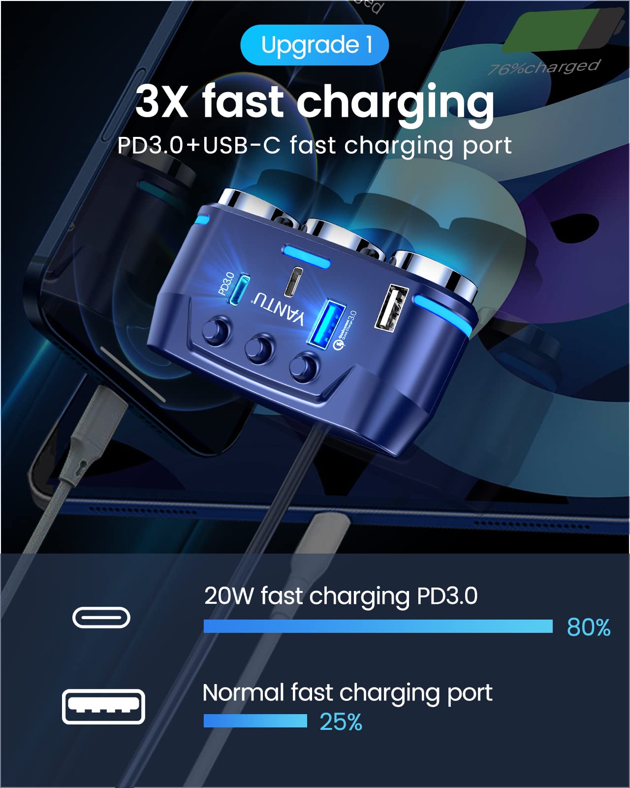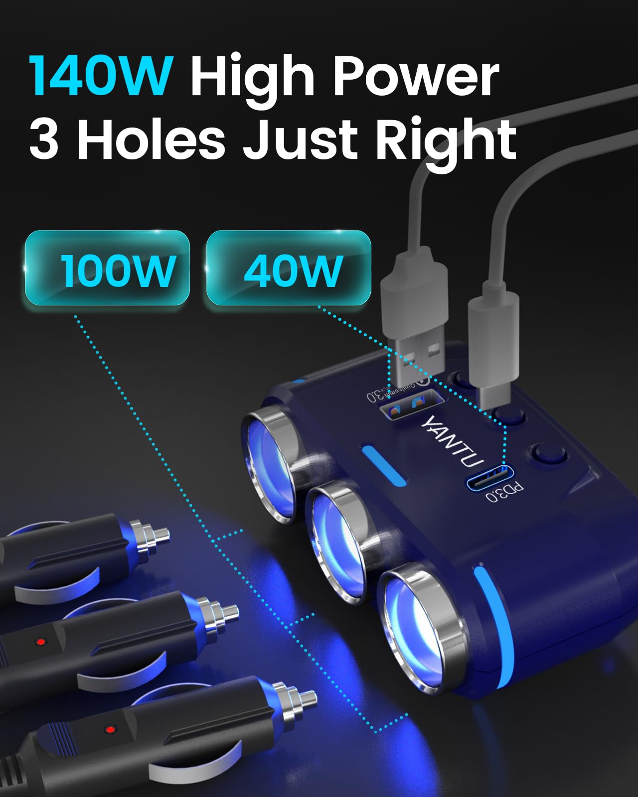 Yantu Qc3.0&Pd 40W Cigarette Lighter Adapter, 3-Socket 140W Cigarette Lighter Splitter With 12V Usb Outlet,Car Charger Adapter W