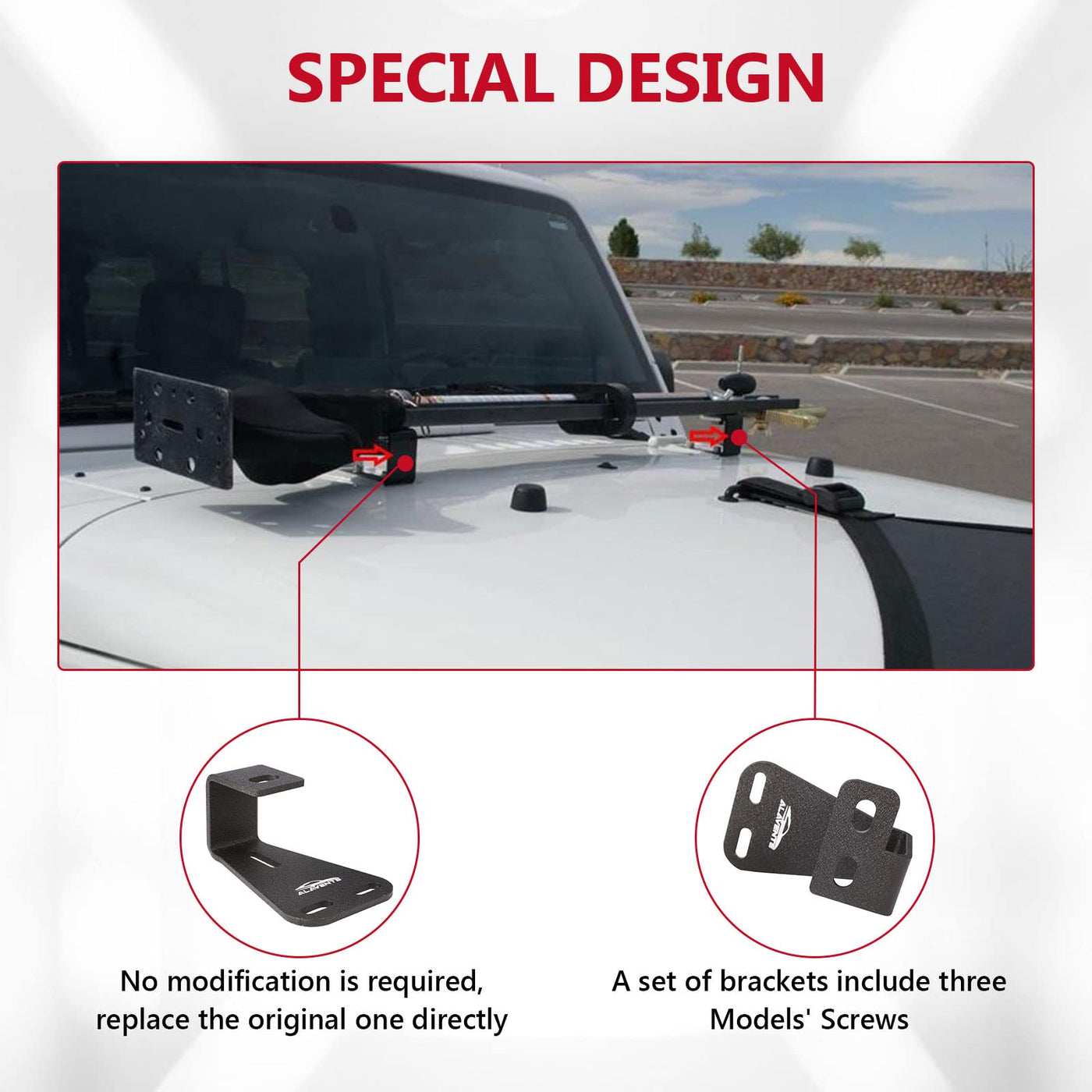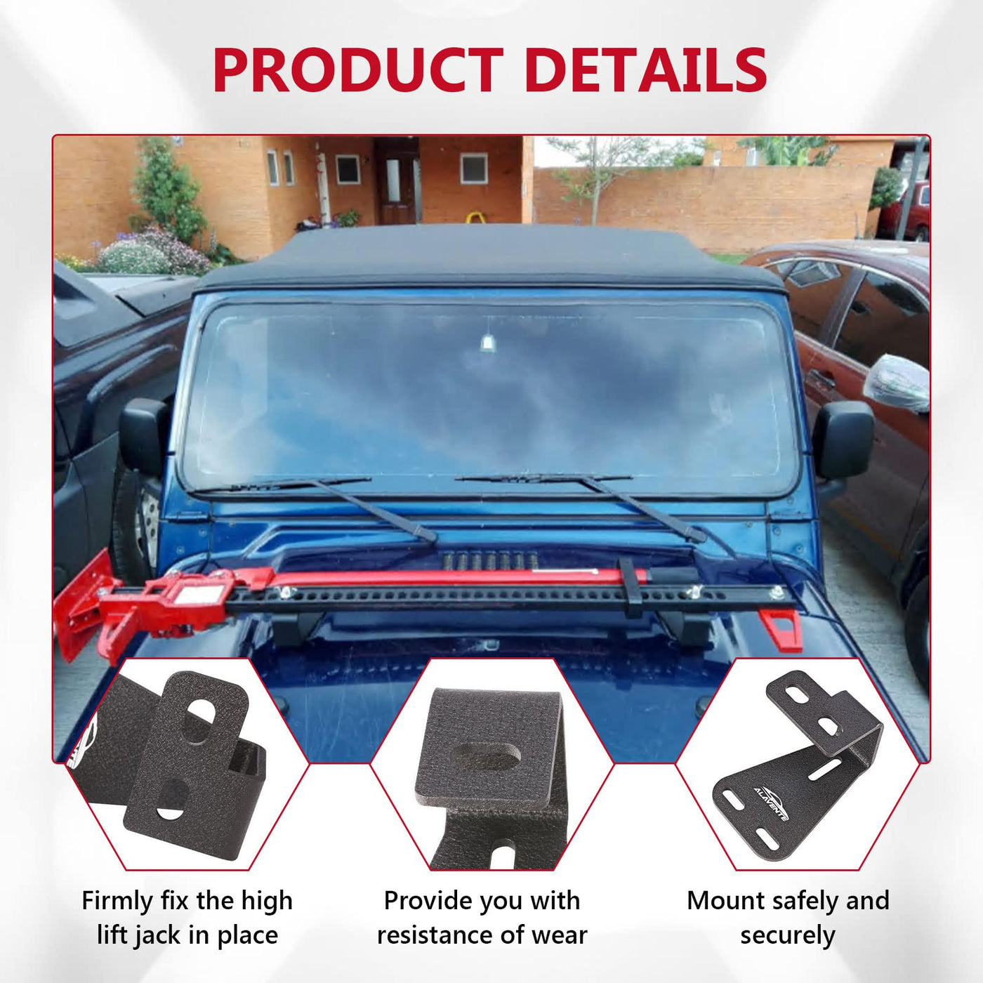 FITMENT: ALAVENTE high lift jack mount hinge mounting hood bracket fit for Jeep Wrangler CJ 1944-1986/ YJ 1987-1995/ TJ 1997-2006 Please verify these mounting hood brackets fit for your vehicle before you purchase. SEPCIFICATION: Quantity: 1 Pair / 2 Pcs Painting: Powder Coated Black Material: Solid Steel Construction Placement On Vehicle: Jeep Hood 1 Set of Brackets Include Three Models' Screws FEATURES: - Aftermarket high lift jack mount hinge mounting hood bracket fit for Jeep Wrangler CJ 1944-1986/ YJ 1987-1995/ TJ 1997-2006 (2pcs/set); - Solid steel construction, powder coated black surface with rust resistance, provide you with a lifetime of resistance against wear; - Slotted bolt holes are to accommodate most generic high lift jacks; - No modification is required, replace the original one directly; - Ultimate solution to add more lights without too many bulky brackets; - Mount safely and securely whether you are out on the trail or climbing the rocks. NOTICE: The high lift jacks are not included. The pictures with high lift jacks are for reference only! PACKAGE INCLUDED: 1 pair of hood mount brackets for Jeep CJ YJ TJ, three models' screws are included as picture show