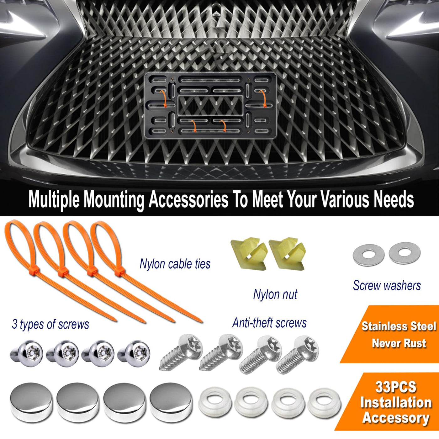 Suitable For Vehicle With Bumper Outline To Install Front License Plate Bracket Frame,Adding An Additional Novelty Car Tag Holder Cover To Any Vehicle, Trailer, Truck,Includes All Mounting Accessories For Front Or Rear License Plate Brackets And Stainless Steel License Plate Framethe Best Way To Install License Plates For New Front Bumperssaves You 60% Of Your Moneyplastic License Plate Mounting Brackets And License Plate Stainless Steel Holder Are Ideal For Contoured Bumpers And Can Also Be Used As Spacer&Nbspin Recessed License Plate Areas On The Rear Of The Carthe Bracket Measures 6 X 12 Inches And Is Suitable For All Standard Or Novel American License Platesthe Personalized License Holder Kit Includes:A 1 Front License Plate Mounting Bracket For Vehicles With A Bumper Profilea 1 Stainless Steel Mirror Polished License Plate Framea 2 Nylon License Plate Inserts (Expansion Nuts) Insert Nuts To Replace Your Old License Plate Insertsa 4 High-Quality Plastic Cable Ties To Secure The Plastic Bracket And Bumper To Prevent Looseninga 2 Self-Tapping Screws To Install The Bracket To The Front Bezela 8 Mechanical Screws Securing The License Plate To The Bracket (Including 4 Anti-Theft License Plate Screws)A 8 Pcs License Plate Pads, No More Rattling Noise From Car License Platesa 1 Anti-Theft Screwdriversafety:The License Plate Bracket Is Securely Mounted On The Front Bumper Of The Vehicle, Which Secures The License Plate In Place Regardless Of The Roadinstallation Steps:Insert The Expansion Nut Into The Car Bumper Cover Tighten The Mounting Bracket To The Trunk Lidkeep Your License Plate Firmly Between The License Plate Mounting Bracket And The License Plate Frame
