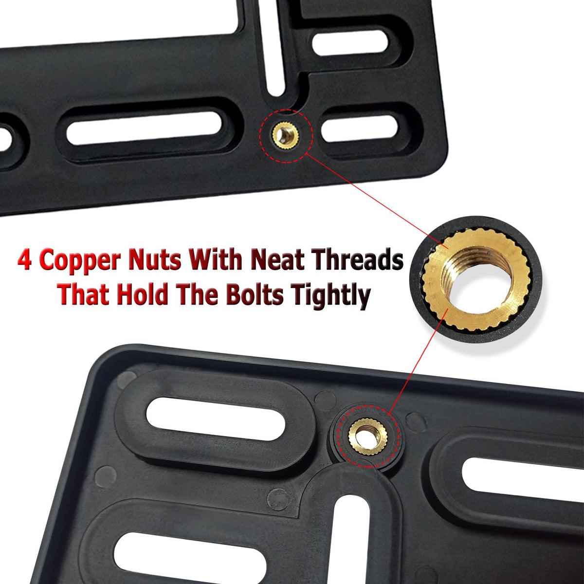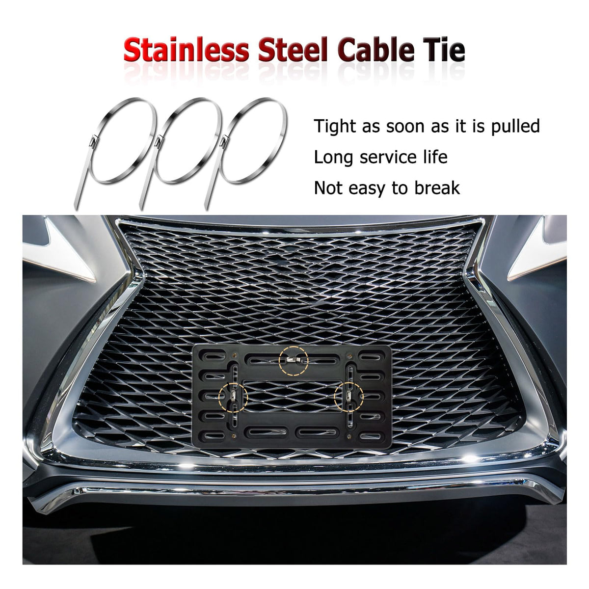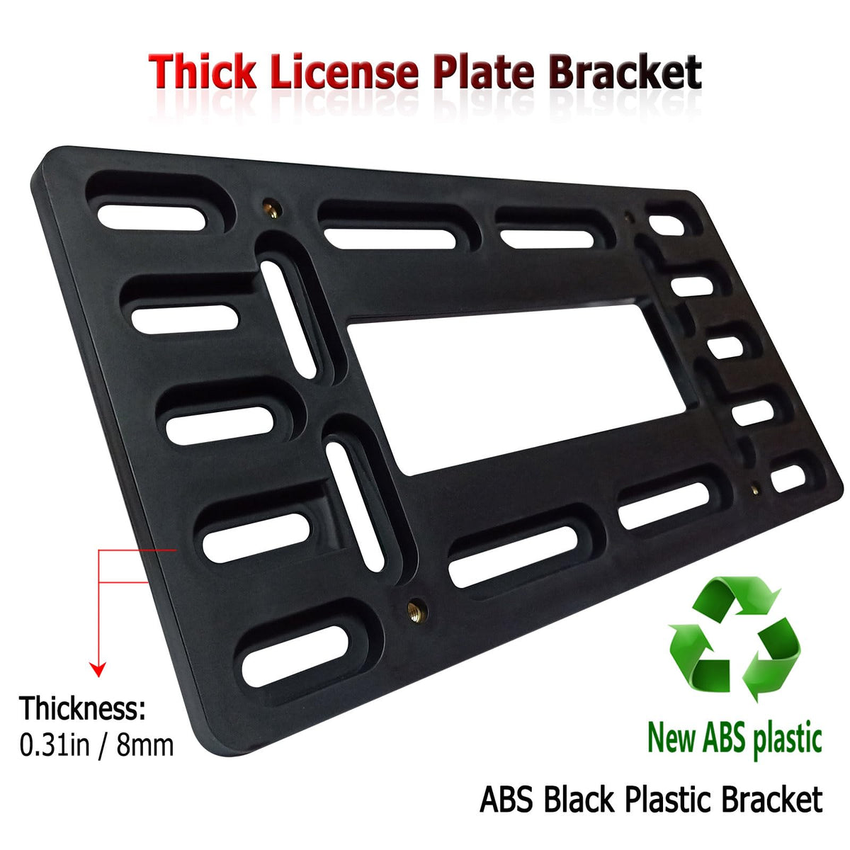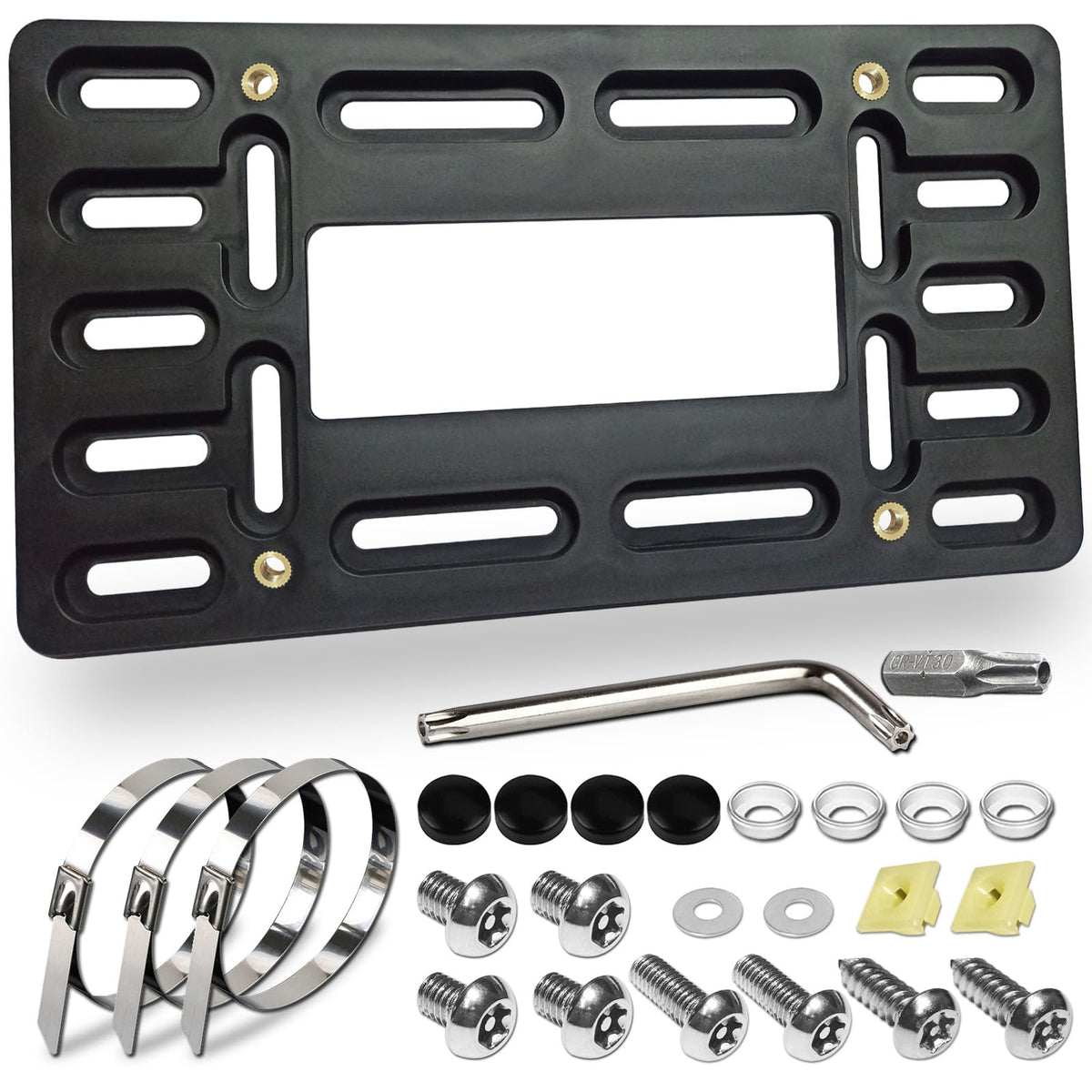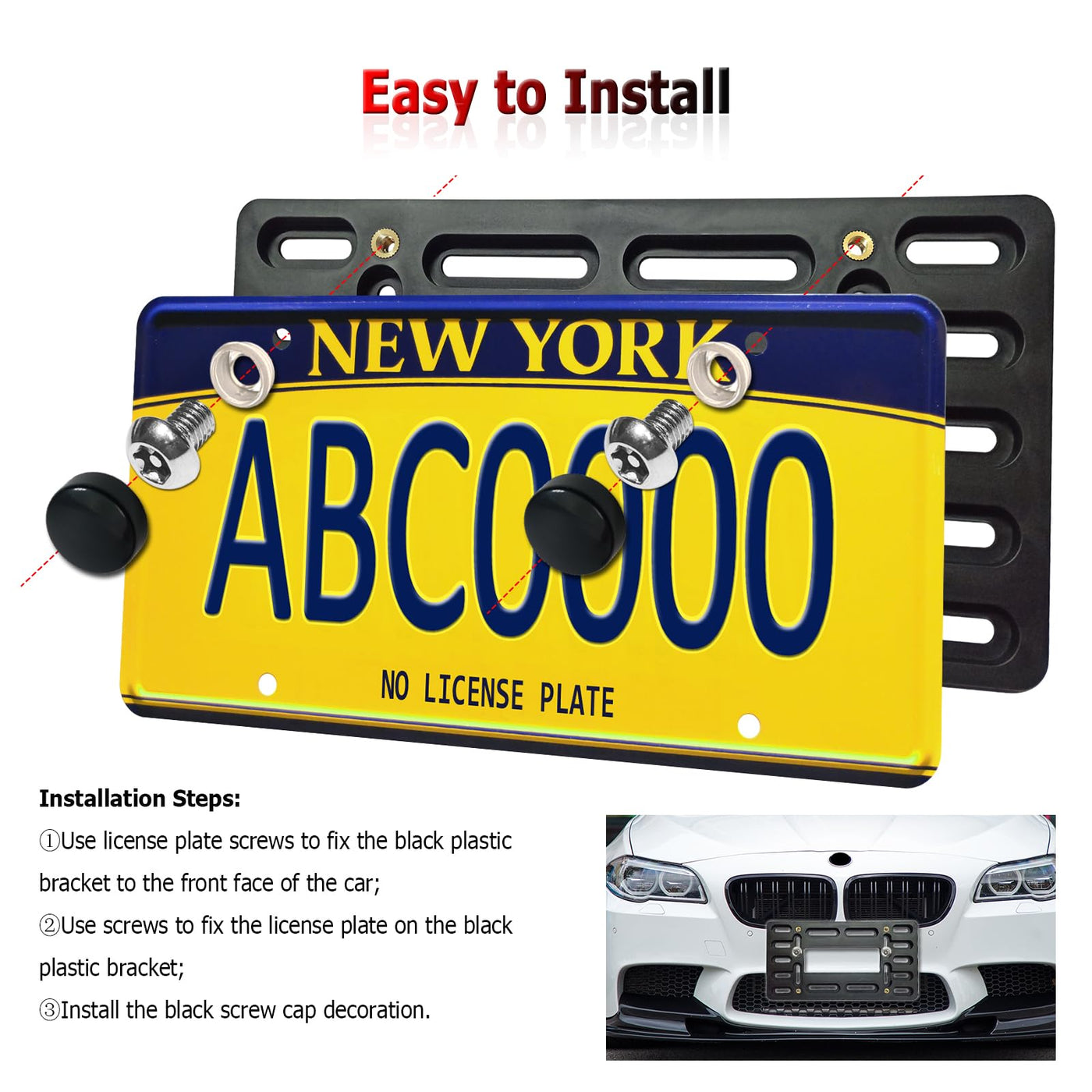 If your car's front bumper has only 2 non-standard pre-drilled holes; If your car has not holes but needs to install a front license plate; Well, Our front license plate mount kit is the right choice for you! Easily complete the front license plate mount without damaging your existing bumper. Advantages of our Front License Plate Holder Kit: There are multiple mounting holes on the black plastic license plate bracket, which can be adapted to the pre-drilled holes of the bumper in different positions; The screw hole with copper metal thread firmly locks the license plate; Nylon license plate inserts (expansion nuts) insert nuts to replace your old license plate inserts; High-quality stainless steel ties to secure the plastic bracket and bumper to prevent loosening; 2 self-tapping screws or mechanical bolts. to install the bracket to the front bumper; 4 M6*12mm anti-theft mechanical bolts fix the tag plate on the license plate holder; Black license plate screws caps covers and washer.