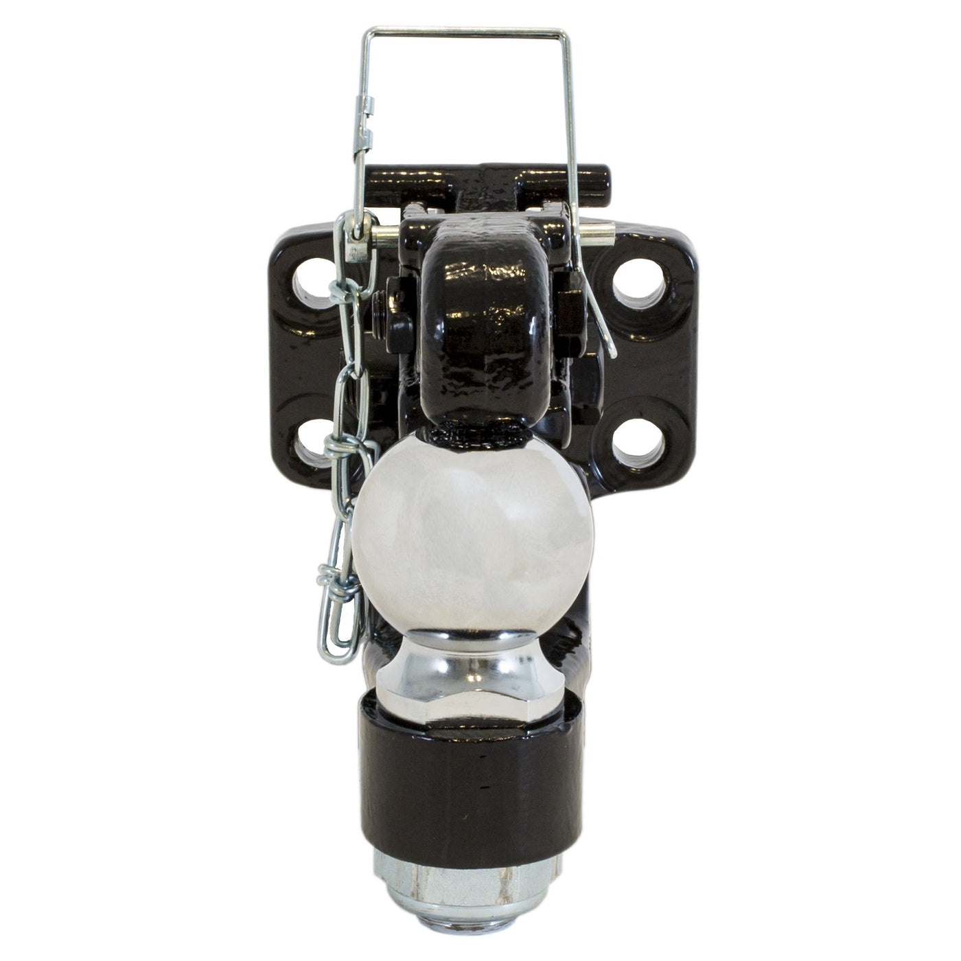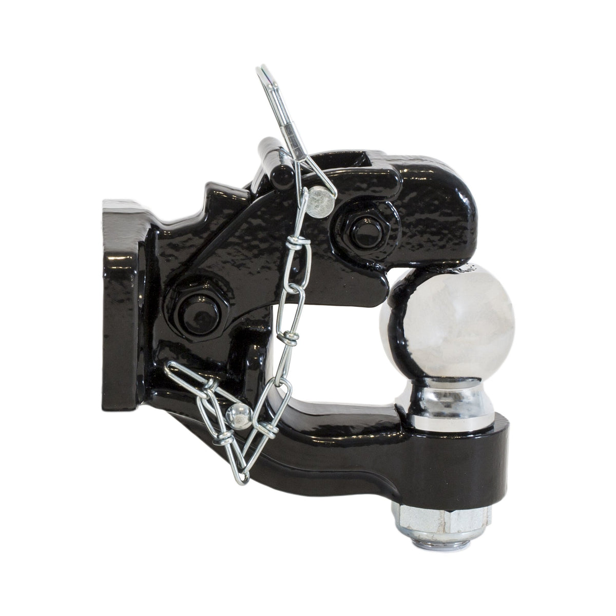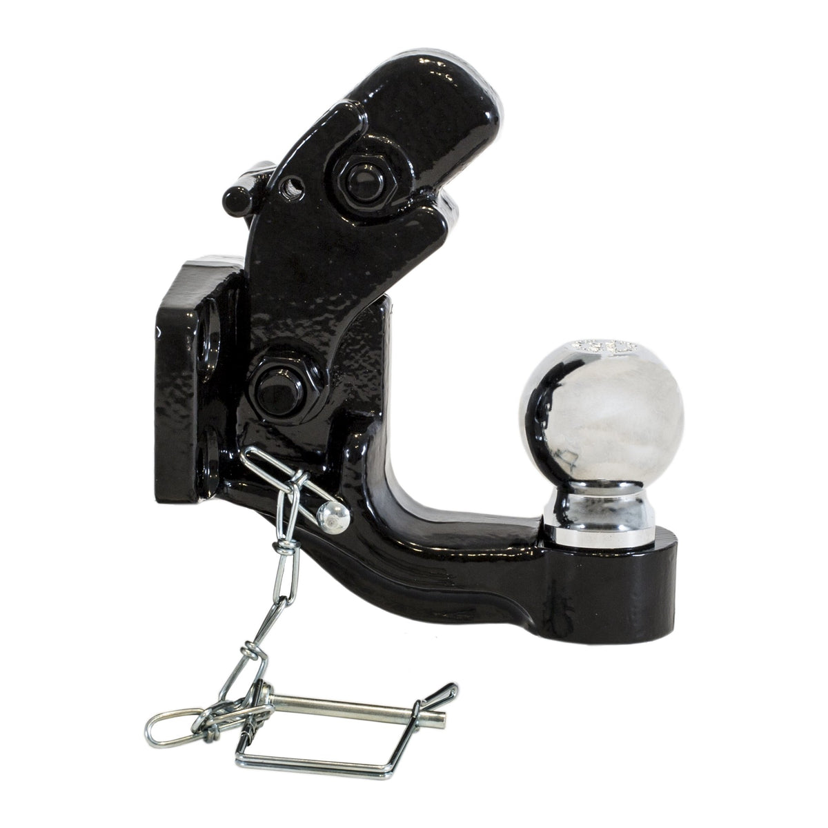 Pintle Hook And 2-5/16 Inch Chrome Ball Combination With Positive Locking Latch And Tethered Pin. This Pintle Hook Now Comes Complete With 1/2 Inch Grade 8 Mounting Hardware. Black Powder Coat Finish. Product Made In China.
