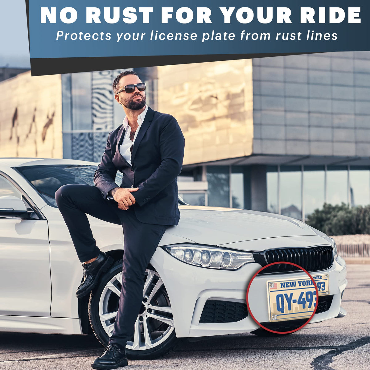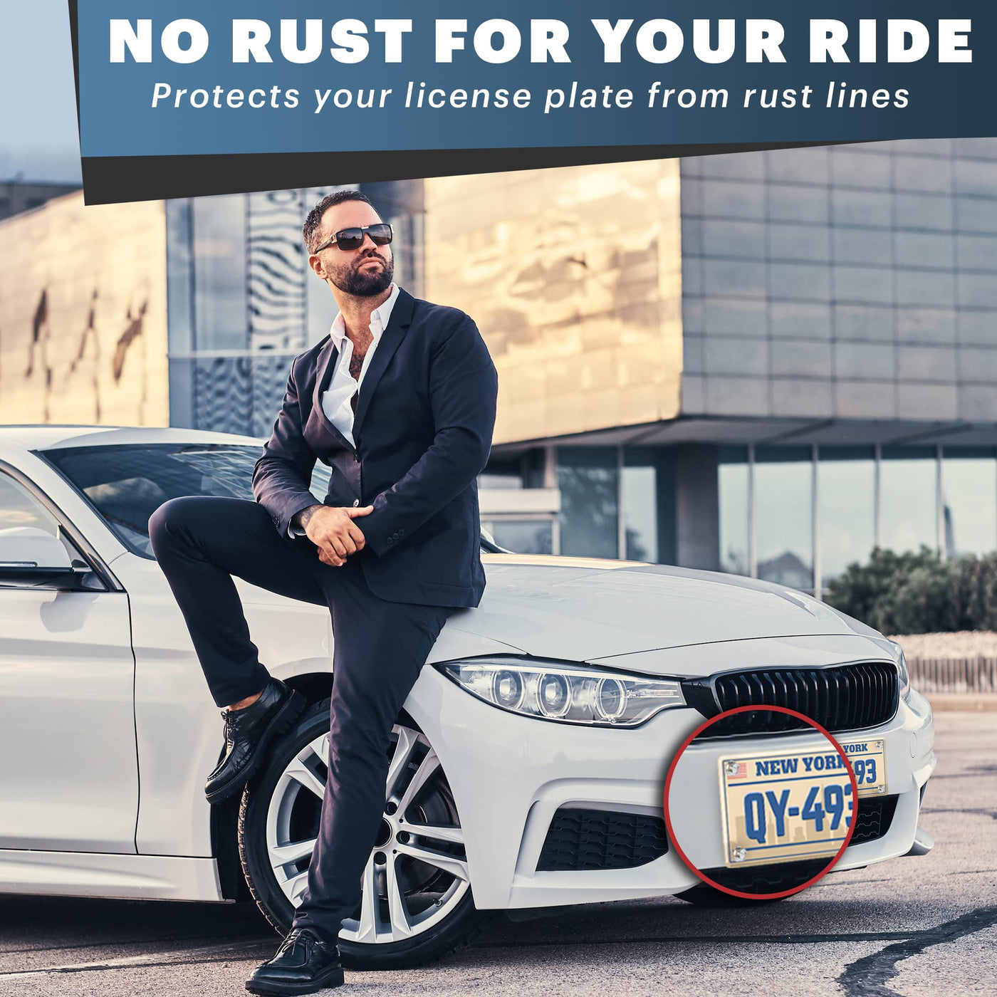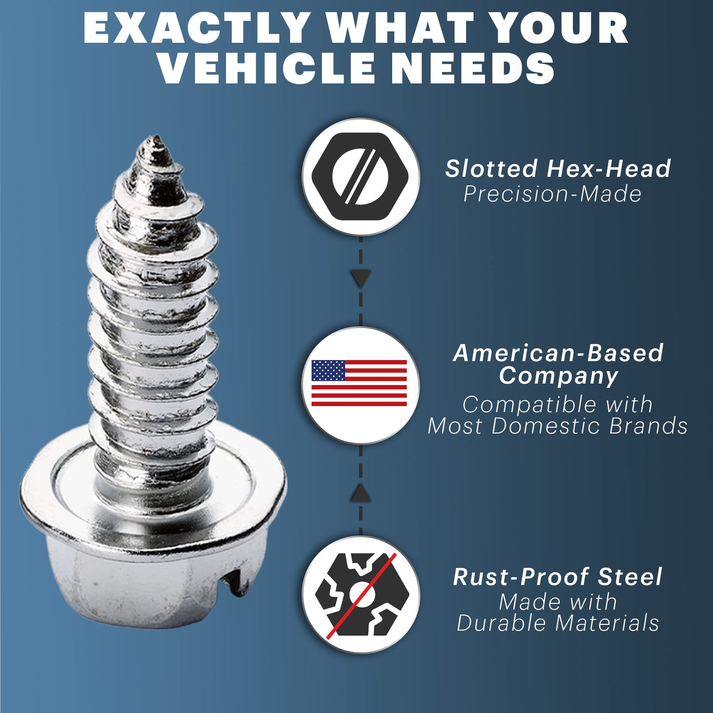 Revolution Car Badges: Set of 8 Fasteners for Mounting License Plate (Chrome Plated) Our motto is: Buy it once, buy it to last. It doesn't matter what the part is, when it's on your car it needs to be built to survive the toughest conditions. We use 316 marine grade stainless steel to ensure that these screws are resistant to corrosion and are completely rustproof. They will survive the salty air of the ocean side and salty roads during winter weather, and extreme hot and cold temperatures.