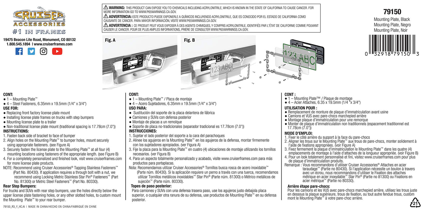 The Mounting Plate Is Ideal For Vehicles With Contoured Bumpers, Mounting License Plates To A Trailer, Or Adding An Additional Novelty Plate To Any Vehicle. Cruiser Accessories Is A Family Owned Business That Has Been Manufacturing And Selling License Plate Frames For Over 30 Years. Through Innovation, Attention To Detail And Many Patented Designs, Cruiser Has Evolved Into The Largest Supplier Of License Plate Frames, Novelty Plate Shields And Mounting Hardware In The Automotive Aftermarket. Cruiser'S Product Line Also Includes Both Standard And Exclusive Star Pin Locking Hardware, Designer Fastener Caps, Mounting Accessories, Motorcycle Frames And 3D-Cals Decals. Let Cruiser Accessories Complete Your Rides Look Today!