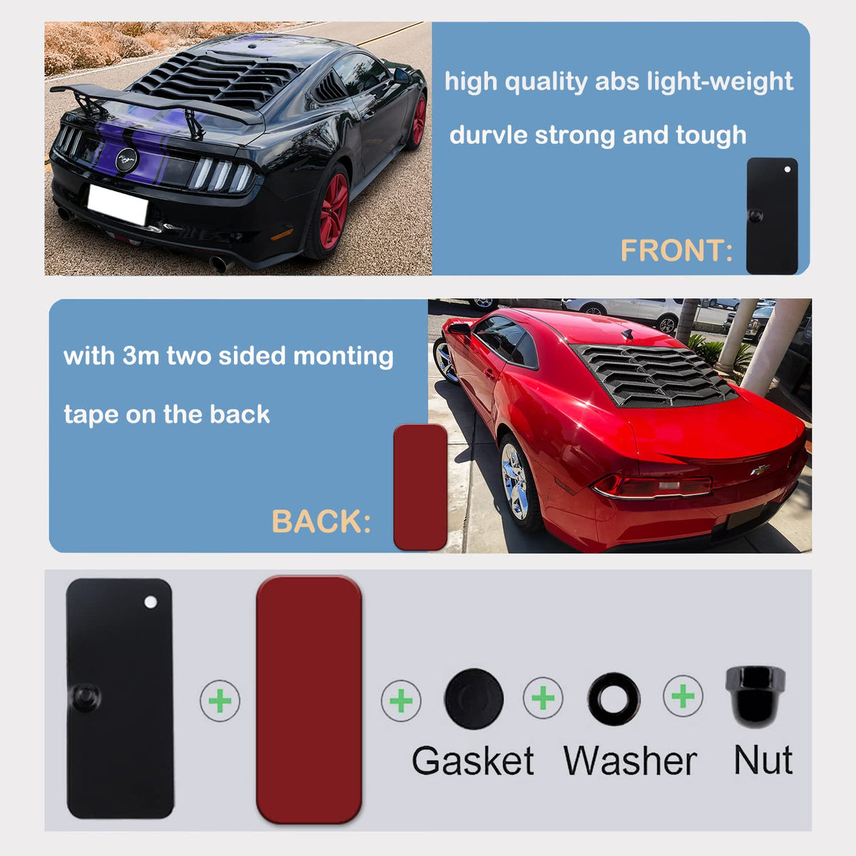 Designed to help you mount rear window louvers, along with some great privacy and sun protection. If you're looking to install a rear window louver, these kits have everything you need to make your installation a breeze and ensure a perfect fit and finish. Fitment: Available for Ford, Mustang, Dodge, Challenger and Camaro Installation Detail: step1. Clean the surface area of C-Pillar glass; step2. Measure the 3M double-sided tape position of the louver on the rear windshield; step3. Peel of the 3M tape and stick it on the glass; step4. Align on the 3M tape position and tighten the attached nuts to complete the installation.