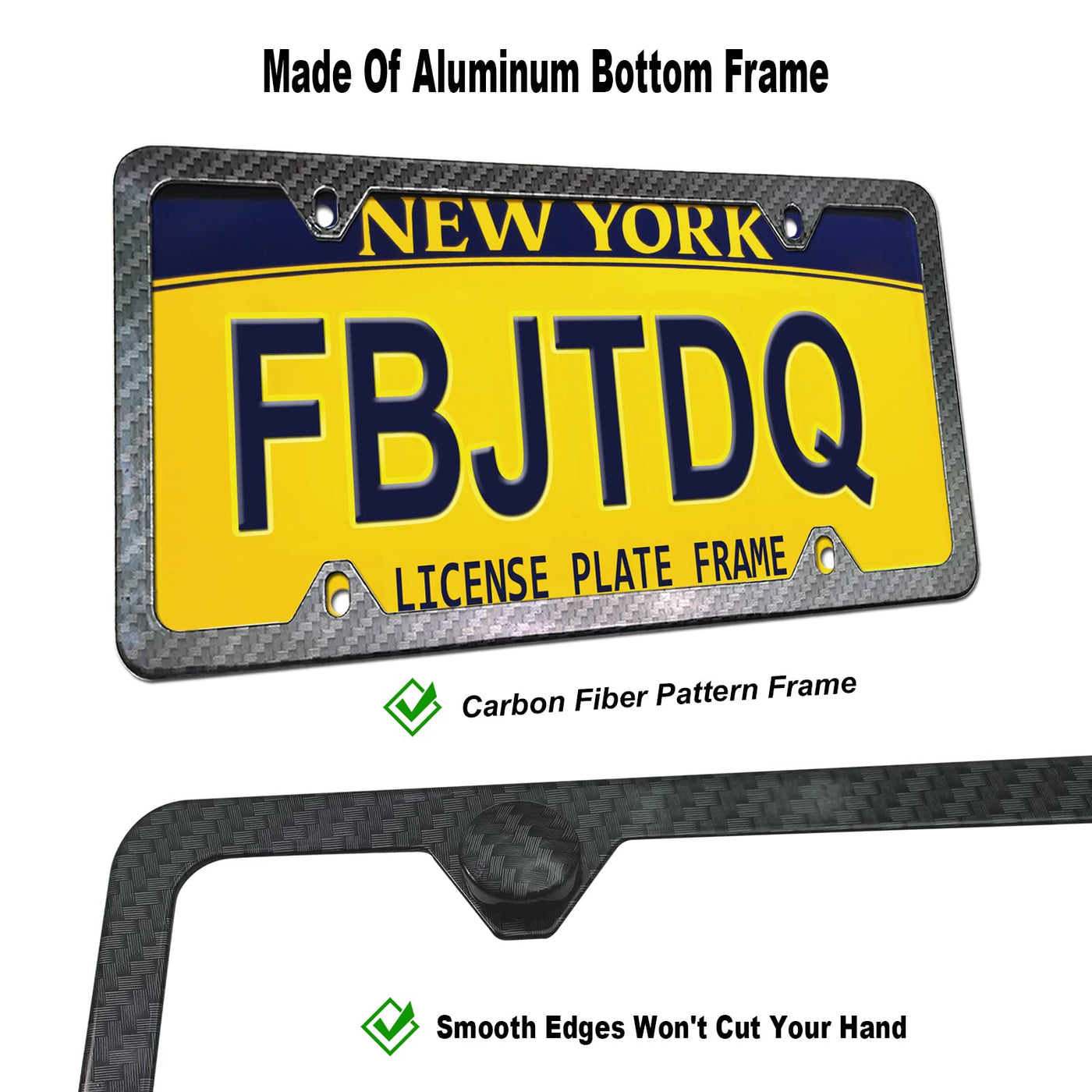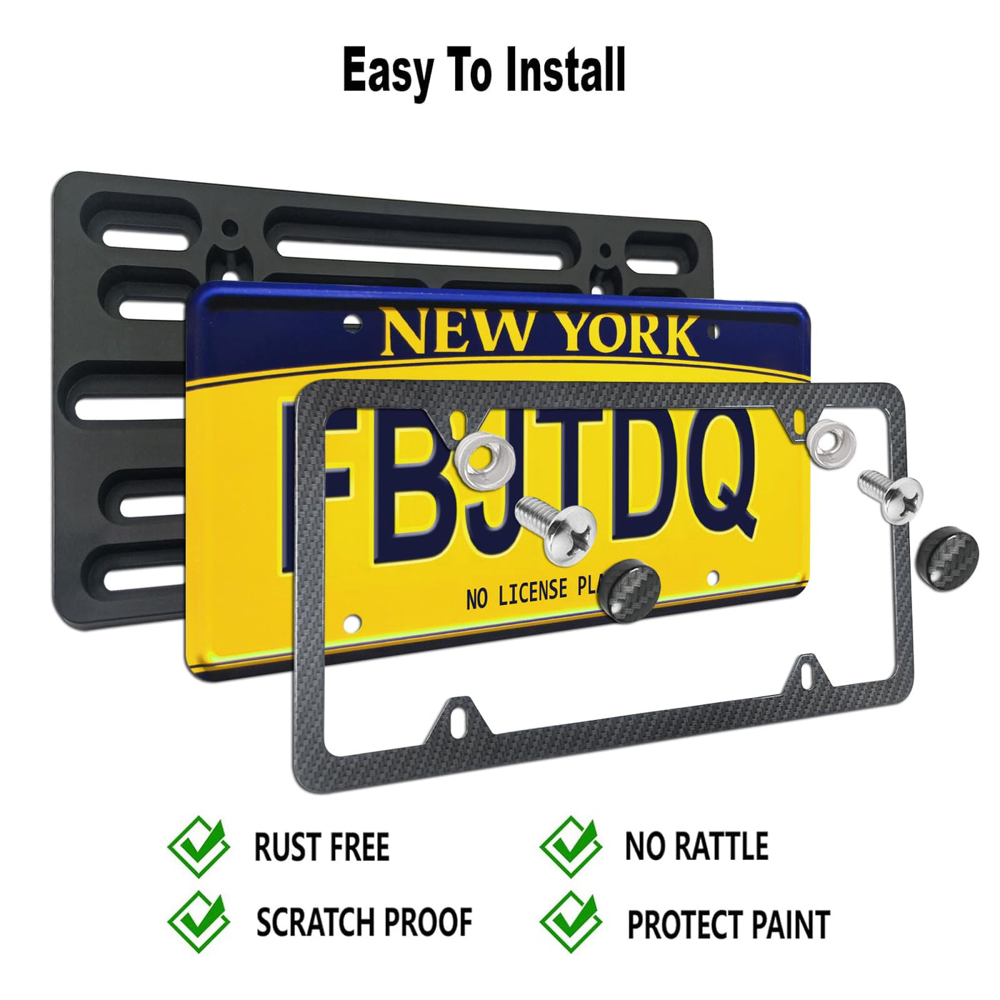 FRONT LICENSE PLATE MOUNTING KIT-Front License Plate Bracket and License Plate Frame Combo-Perfect for front bumpers without license plate pre-drilled holes or only 2 pre-drilled holes!?Includes 1 pack front license plate bracket adapter, 1 pack carbon fiber license plate frame, and plate mounting hardware- stainless steel license plate screws;?The license plate adjuster has flexible screw mounting holes, suitable for pre-drilling bumpers with different hole distances;?Heavy duty metal- aluminum Frame, anti-corrosion and anti-rust, good license plate protector;?The surface of the metal aluminum frame is printed with carbon pattern, and the diagonal woven pattern is clear and three-dimensional, which is a good decorative license plate;?The Slim Frame will not block the license plate registration sticker, which is applicable to all states in the United States;?Designed according to the standard 12*6 Inch license plate, suitable for all standard license plates of the United States/Canada;?Provide stainless steel license plate mounting hardware- M6*12mm and M6*20mm screws can fasten the license plate, frame and bracket;?License plate frame with Carbon Caps, make your license plate always shine;?The black foam license plate pad is pasted on the back of the license plate to prevent the license plate from scratching the car paint and reduce noise;The kit includes:1 x License Plate Bracket1 x License Plate Frame8 x License Plate Screws4 x Screw Caps4 x Cable Tie2 x Nylon Inserts8 x License Plate Pads
